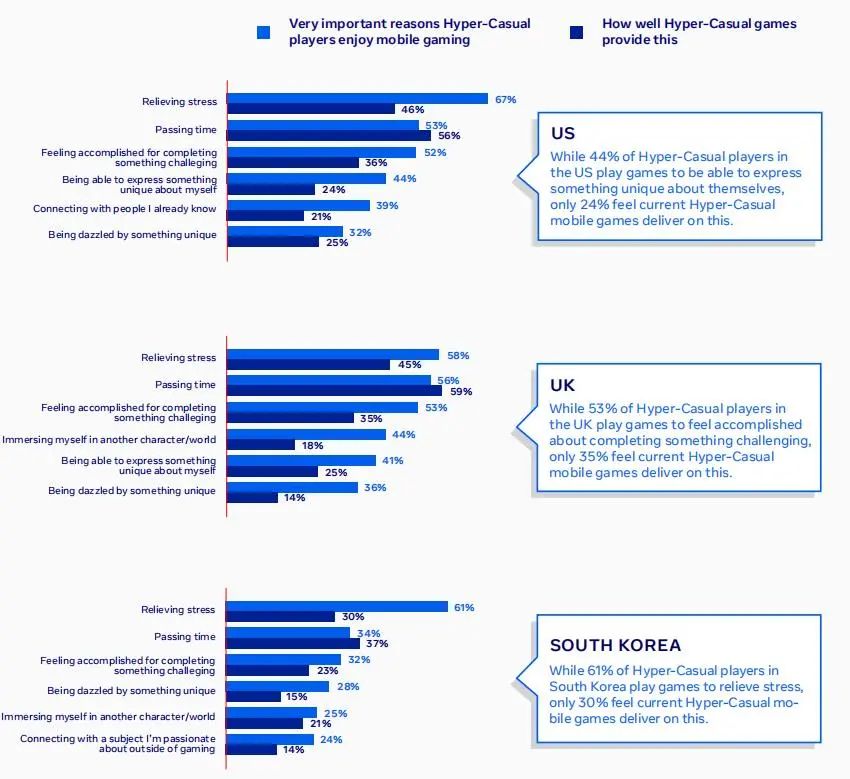 超休闲游戏玩家玩手游的最主要原因是释放压力和打发日常活动之间的时间,他们觉得目前的游戏往往可以起到这些作用。