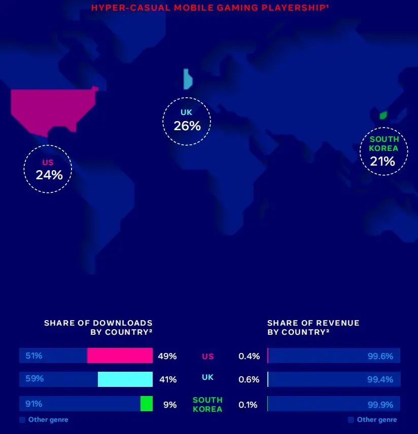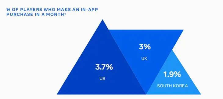 在美国、英国和韩国,超休闲游戏是玩家们最不愿意付费的品类之一,只有不到4%的玩家进行过内购。