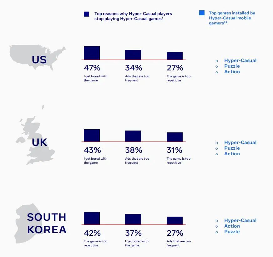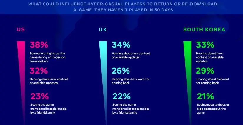 在英国和韩国时长,玩家们对于新内容或者更新相关的广告非常感兴趣,接近三分之一的超休闲游戏玩家表示这会带来比较大的影响。对于美国用户来说,朋友的影响很重要,38%的人表示,如果有人在谈话中提到某个游戏,他们会回到游戏中,社交媒体热度也可以帮助美国和英国五分之一的老玩家回流。