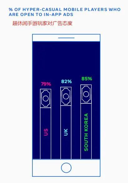 由于超休闲游戏玩家的内购付费率极低,游戏内广告成为开发者们重要的变现手段。超休闲游戏玩家理解用广告交换价值的意义,79%的美国用户和85%的韩国玩家表示他们不介意看到游戏内广告。