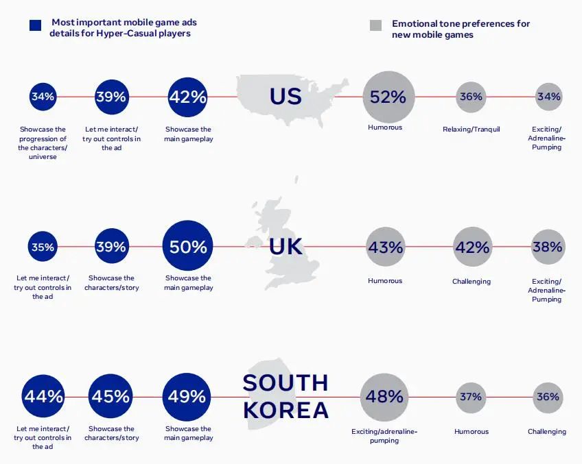 超休闲游戏玩家喜欢传递幽默感和刺激感的新游戏广告,48%的韩国超休闲游戏玩家选择带来肾上腺素刺激的主题(美国为34%)。相反的是,美国52%的超休闲游戏玩家喜欢趣味广告,而韩国玩家只有37%的人喜欢幽默广告。