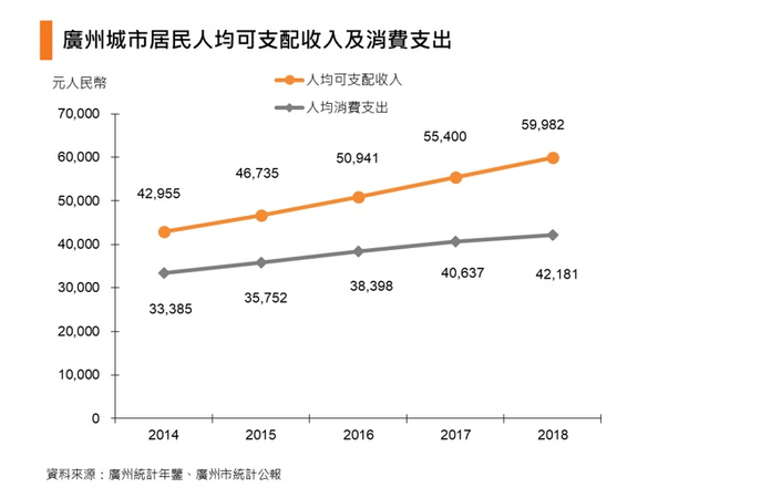 2018年,广州城市常住居民人均可支配收入是59,982元,人均消费支出则是42,181元。2017年,广州城市居民最高收入户的人均可支配收入达到98,524元,而最高收入户的人均消费支出则是63,435元。
