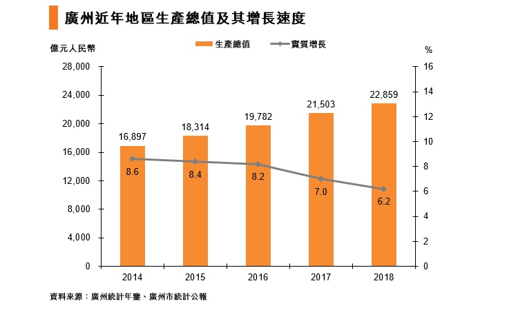 广州不但是广东省的省会城市,也是华南地区主要的金融商业中心,其地位在全国而言也相当重要,因而拥有较强的辐射能力。根据中国社会科学院发布的《2019年中国城市竞争力蓝皮书》,广州的城市综合竞争力在全国各大中城市中排名第6位。2018年全市生产总值达22,859亿元[1],同比实质增长6.2%。第三产业是当地经济重要环节,其所占的比例已由2005年的53%上升至2018年的72%。以常住人口计算,广州人均生产总值达155,491元。