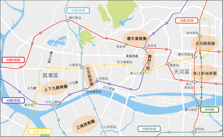 珠江新城商圈为广州的年轻新商圈,是广州政府以200亿打造的「城市新名片」。珠江新城作为天河中央商务区的核心,与地铁3号线,5号线和APM线联通,聚集众多金融机构、公司总部和办事处,以高档物业为主。高级住宅的住户、甲级写字楼的白领、五星级酒店的客人,构成了珠江新城以高端层次、商务主导的消费商圈。珠江新城同时为旅游热点,多个地标坐落此地段,包括广州大剧院、广东省博物馆、广州图书馆、珠江新城双子塔和广州第二少年宫。围绕花城广场聚集多个购物中心,包括花城汇、高德置地广场、广州K11购物艺术中心,以及广州友谊商店。