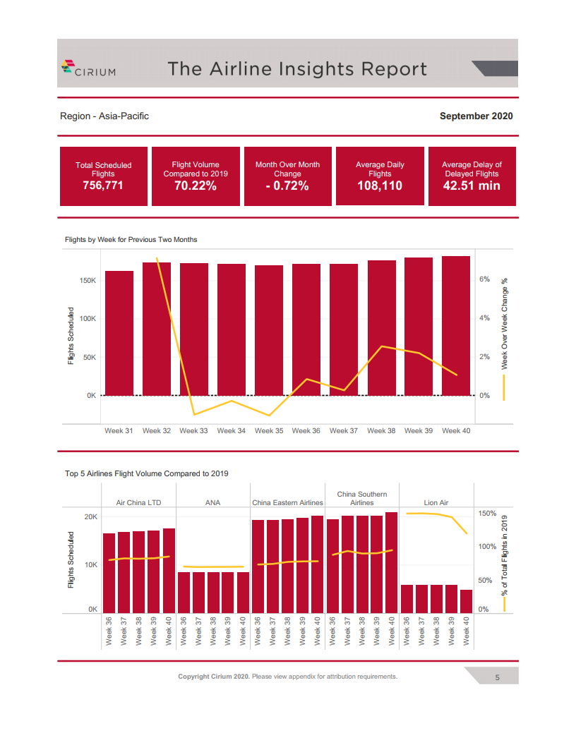 Cirium飞机运营产品主管James Hetzel表示:“与去年同期相比,亚太区9月份的计划航班数已恢复七成多。该地区持续引领着全球航空的复苏进程,其中中国占主导地位。”