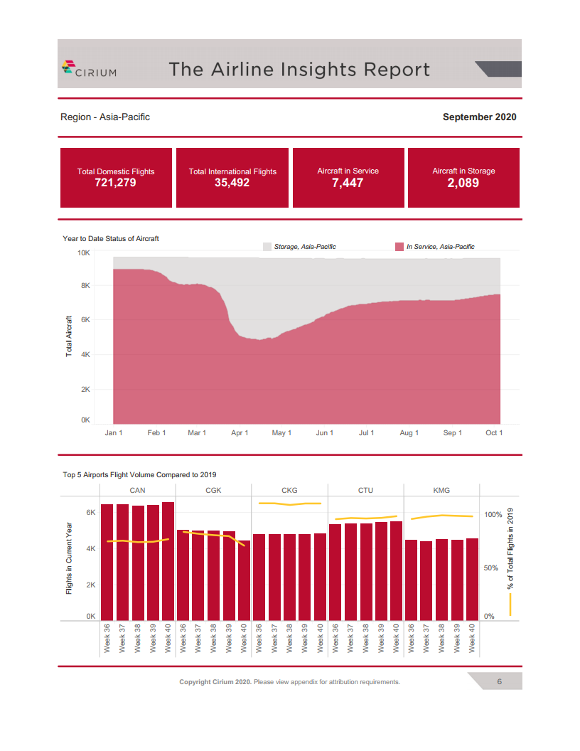 具体看亚太地区,9月份计划航班总数为756,771个,已恢复到去年同期的70.22%。其中国内航班数为721,279个,国际航班数为35,492个;在役飞机为7,447架,停飞飞机为2,089架。