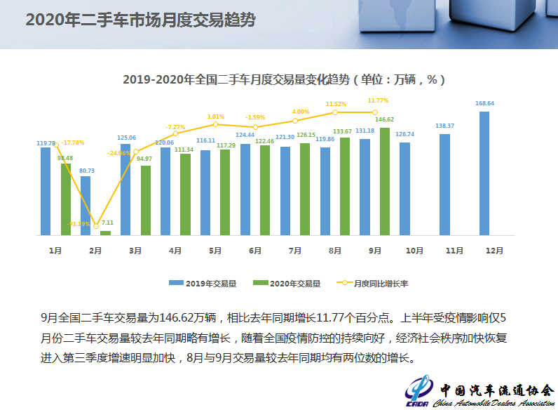 9月全国二手车交易量为146.62万辆,相比去年同期增长11.77个百分点。上半年受疫情影响仅5月份二手车交易量较去年同期略有增长,随着全国疫情防控的持续向好,经济社会秩序加快恢复进入第三季度增速明显加快,8月与9月交易量较去年同期均有两位数的增长。