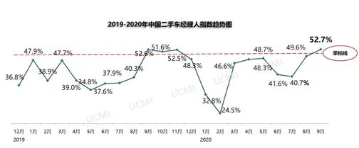 2020年10月13日,中国汽车流通协会发布最新一期“中国二手车经理人指数”(UCMI)。本期UCMI结果显示,9月份二手车经理人指数为52.7%,比8月份上升3.1个百分点,回归到荣枯线以上,二手车市场表现有所好转。