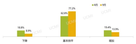 调查显示, 9月份二手车销量基本持平,接受调查的二手车经理人认为“增加”的比例为13.9%,认为“下降”的比例为8.9%。