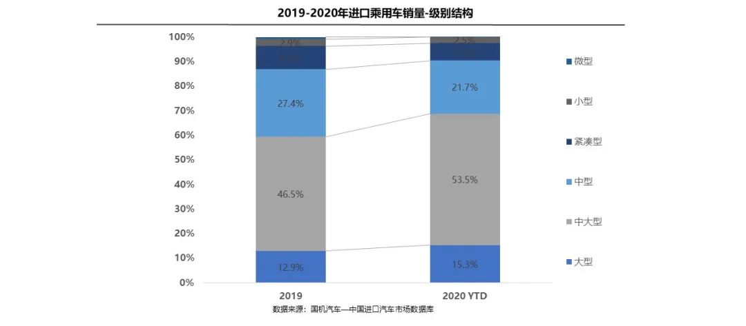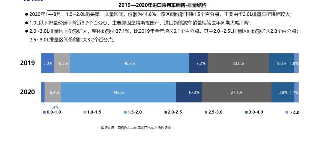 2020年1—8月,1.5~2.0L保持在第一排量区间,份额为44.6%,但下降1.5个百分点;由于特斯拉国产,1.0L以下排量份额下降近3.7个百分点;2.0~3.0L排量区间份额扩大,整体份额为37.1%,比2019年全年增长6.1个百分点。