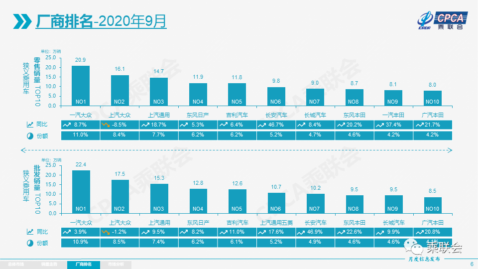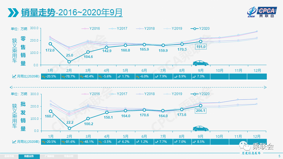中国汽车流通协会: 2020年9月份全国乘用车市场分析 1、9月全国乘用车市场回顾 零售:9月乘用车市场零售达到191.0万辆,同比去年9月增长7.3%,实现了连续3个月8%左右的近两年最高增速。今年1-9月的零售累计增速-12.5%,较1-8月累计增速-15.2提升3个百分点,体现行业的快速回暖态势。 今年全国乘用车市场7-9月增速保持强势态势。这首先是宏观经济和出口市场超预期的回暖,尤其是欧美疫情背景下的中国出口表现较强,稳定了消费信心。其次是去年部分地区7月国六实施后导致的车市低基数的特殊因素促进。第三是新能源车零售的翻倍回暖态势明显,推动车市走强。 考虑到今年中秋后移到10月,9月环比8月的零售增长12.1%,这相对历年的平均环比增速15%并不高,主要也是成都车展带动的秋季购车潮启动早,北京车展引发的新品等待现象并不明显,9月车市保持较强的火爆增长气氛。世界疫情背景下的开学季前的购车需求属于刚性的安全出行需求,因此9月的双节前消费需求难抵开学季拉动。 9月豪华车零售同比增长约33%,环比8月增长约5%,市场份额保持约15%的历史高位。消费升级的高端换购需求,加之豪华车型促销折扣价格下探带来的价格优势,迅速引领细分市场回暖。 9月自主品牌零售同比增长约1%,环比8月增长约16%,市场份额34.9%,较同期份额下降1.7%。国有自主表现超强,红旗、长安、蔚来等品牌同比高增长。 9月主流合资品牌零售同比增长约7%,且环比8月增长约12%;其中日系品牌零售份额24.5%,低于德系的26%份额;美系品牌份额走强达到10.0%,同比份额增加1.4个百分点。 20年1-9月的全国乘用车市场累计零售1292.5万辆,零售同比累计下降12.5%,今年累计销量同比下降184.7万辆,约占去年零售总量9个百分点。今年零售下降主要是受到春节偏早和疫情因素对一季度影响208万辆,二季度零售同比损失只有17万辆,三季度的7-9月出现增量38万辆。 出口:9月乘联会乘用车整车与CKD出口6.2万辆,同比增长32.8%。其中自主品牌出口达到5.7万辆,同比增长134%,合资品牌出口下滑80%。 生产:9月乘用车生产201.2万辆,同比19年9月增长10.1%;1-9月累计生产1283.1万辆,同比下降12.5%,产量减少183.6万辆。9月豪华车生产同比增长35%,合资品牌同比增长6%,自主品牌同比增长8%。 批发:9月厂家批发销量206.1万辆,同比去年9月增长8.5%,环比8月增长18.7%。1-9月累计批发销量1310.7万辆,同比下降12.5%,减少188万辆。今年的休假对8月厂家销量带来损失,为国庆中秋双节的9月厂家批发正常补库。 库存:9月末厂家库存减少5.2万辆,渠道库存增加8.2万辆。1-9月的渠道库存相对减少22万辆,4-8月的经销商库存持续小幅补充,9月补充力度与历年相近。 新能源:9月新能源乘用车批发销量突破12.5万辆,同比增长99.6%,环比8月增长24.1%。其中插电混动销量2.2万辆,同比增长55%。纯电动的批发销量10.2万辆,同比增长105%。9月电动车高低两端强势增长趋势明显,其中A00级销量3.25万,份额提升到纯电动的32%。9月新能源车市多元化发力,上汽通用五菱24386辆、比亚迪19048辆、特斯拉中国11329辆,分列新能源三强,蔚来、小鹏、威马、合众、零跑等新势力车企很优秀。广汽新能源等也高增长,大集团新能源表现分化加剧。9月普通混合动力乘用车批发3.37万辆,同比去年9月增长17%。 2.10月全国乘用车市场展望 因国庆中秋双节的假日因素,10月有17个工作日,较19年10月少两个工作日,因此车市销量增长压力相对较大。 近期国外部分地区疫情出现二次爆发现象,但国内经济平稳可控,居民消费信心进一步恢复,因此对车市回暖还是有更大期待的。今年北京车展集客和拉升人气效果较好,接触到的部分经销商和用户的心态很好,也预示着今年中国四季度车市持续走强的美好前景。 由于地方政府促消费热情高,10月车市通过厂商经销商店的地方联展带动新车消费。预计四季度厂商也将持续优化经销商库存结构、缩短发车周期、提供更具吸引力的汽车金融方案释放零售潜力。 新能源产品方面,伴随着北京增加放号2万张和电动车新品性能普遍增强,插混车的性价比持续提升,预计四季度国内新能源车市将迎来全面发力的增长期。 10月份我国将进入乘用车市的旺销期。由于国庆双节期间的国内疫情相对平稳,这对四季度的经济社会回暖奠定更强信心。虽然去年10月8日的基数偏高,但10月第一周的乘联会厂商零售数据显示同比8%以上增长,这也是市场总体较强的表现。 近期人民币持续升值,合资企业成本显著下降,促进企业应收恢复,合资企业降价促销势能变大,为逐鹿四季度提供财务势能。目前渠道库存仍保持较低水平,9月的产销回升有助于库存改善和结构优化,冬季库存储备的加库存周期也将拉动厂商批发增量。 3.中国成为疫情下世界车市避风港 2020年以来,中国乘用车市场走势呈现V型反转态势,自2月探底后迅速反转,呈现持续良好的回升态势,这也为很多国际车企化解了市场压力,维持了产业链的良好运转,为世界汽车工业的稳定做出较大贡献。 中国在防控新冠疫情方面的措施卓有成效,体现出中国市场的独特魅力。对国际车企而言,中国市场既是增量的机遇,也是抵御国际不确定风险的避风港。因此中国车市必将继续成为世界最充分竞争的多元化市场。 2020年特斯拉表现优秀,从充满质疑到迅速封神,其涅槃重生的轨迹,体现了中国市场的巨大魅力。否则仅靠疫情下的欧洲和美国市