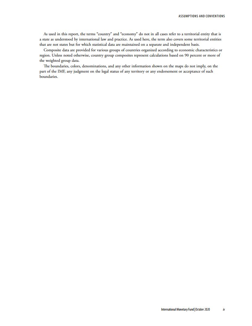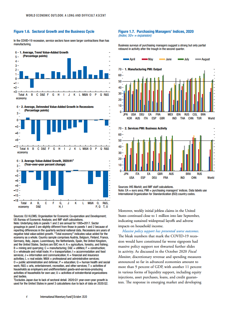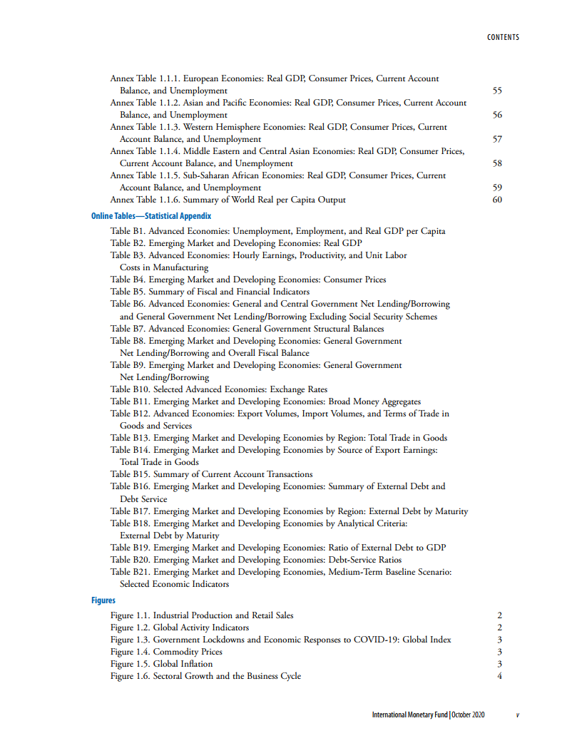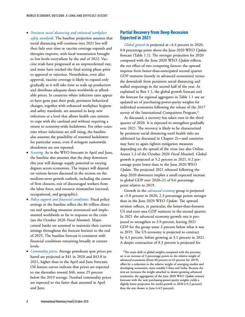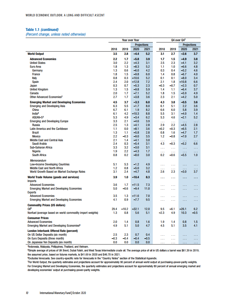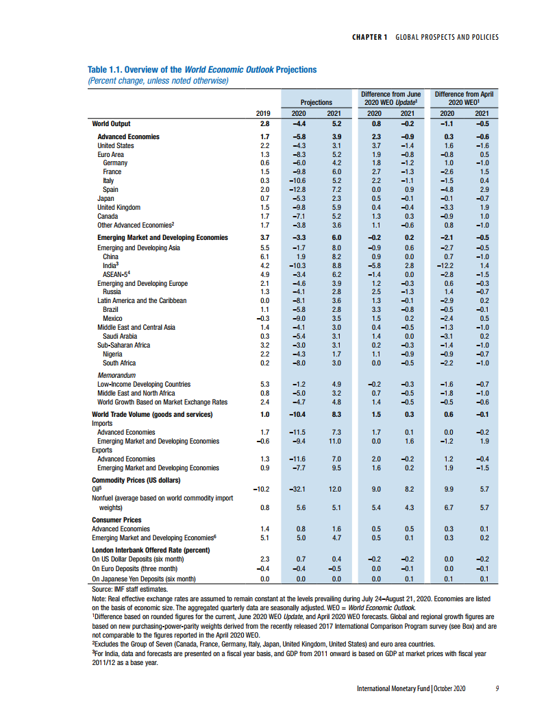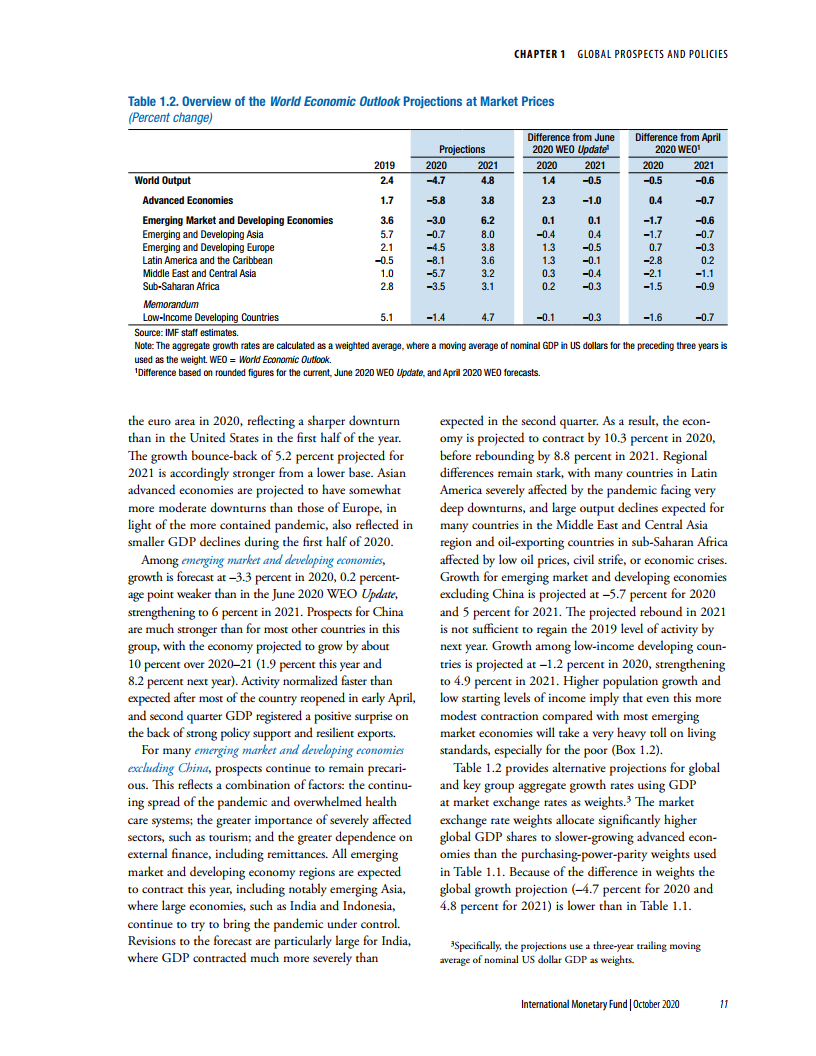 近期前景。2020年全球增速预计为-4.4%,收缩幅度小于2020年6月《世界经济展望更新》 中的预测。对增长预测做出调整的原因是,二季度GDP增长好于预期,特别是在发达经 济体。这些国家在今年5、6月放松了封锁措施,此后经济活动比预期更快改善。此外,有 关指标显示,三季度经济复苏力度强于预期,我们在更新预测时也考虑了这一因素。预计 2021年全球经济将增长5.2%,略低于2020年6月《世界经济展望更新》中的预测。这既体 现了目前我们对2020年经济下滑程度将更温和的预测,又与社交距离将继续下去的预期相 一致。在2020年收缩和2021年复苏之后,我们预计2021年全球GDP水平比2019年略高出 0.6%。上述增长预测意味着,发达和新兴市场经济体今明两年将出现巨大的负产出缺口 和高失业率。