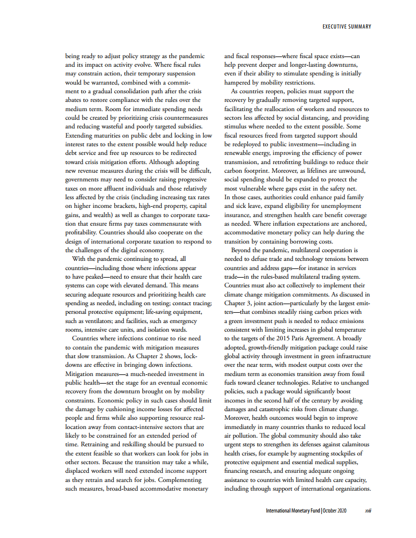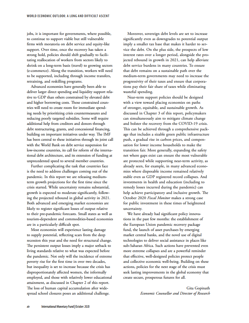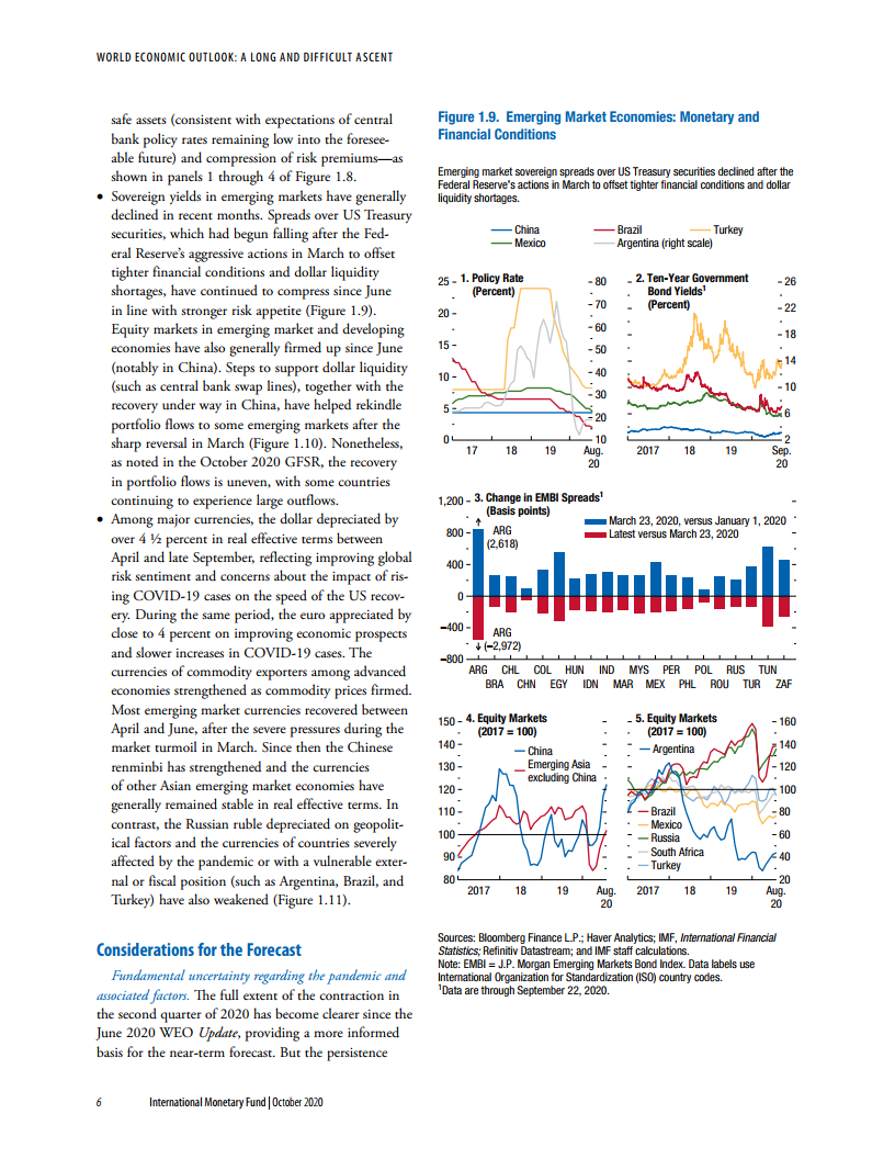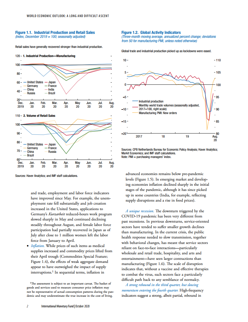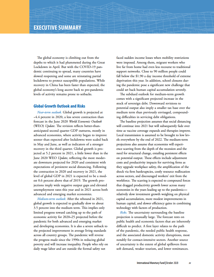全球经济继今年4月“大封锁”期间跌入衰退深渊之后,目前正在恢复。但随着疫情继续 扩散,许多国家放慢了经济重启进程,一些国家再度实施了部分封锁措施以保护易感人群。中国的经济复苏快于预期,但全球经济活动恢复到疫情前水平依然道阻且长,而且极易出 现倒退。