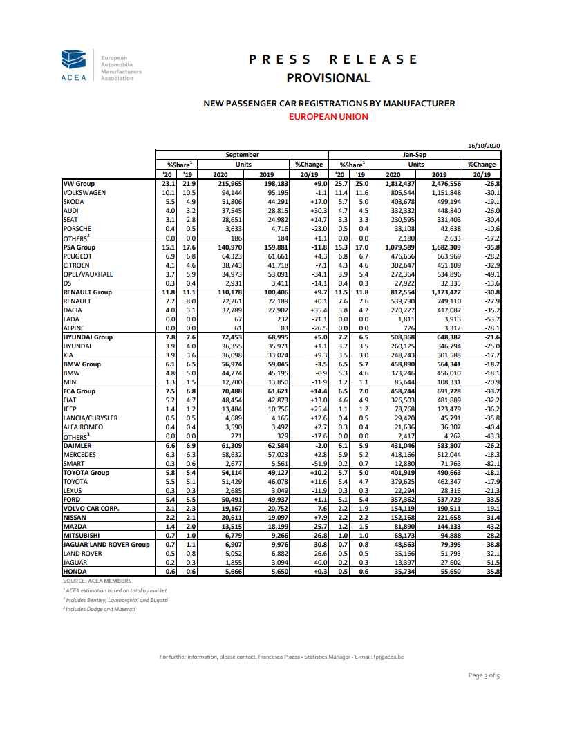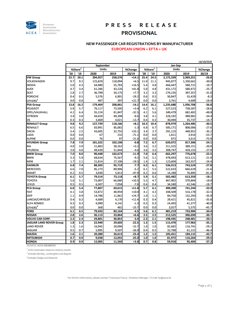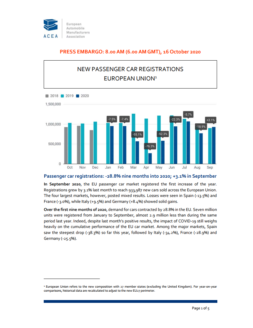 欧洲汽车制造商协会(ACEA)周五发布的数据显示,欧盟、英国和欧洲自由贸易协会(EFTA)国家9月新车注册量同比增长1.1%, 至130万辆,为今年以来首次增长。但随着多个国家新冠病例的激增,人们担心增长势头能否持续下去。