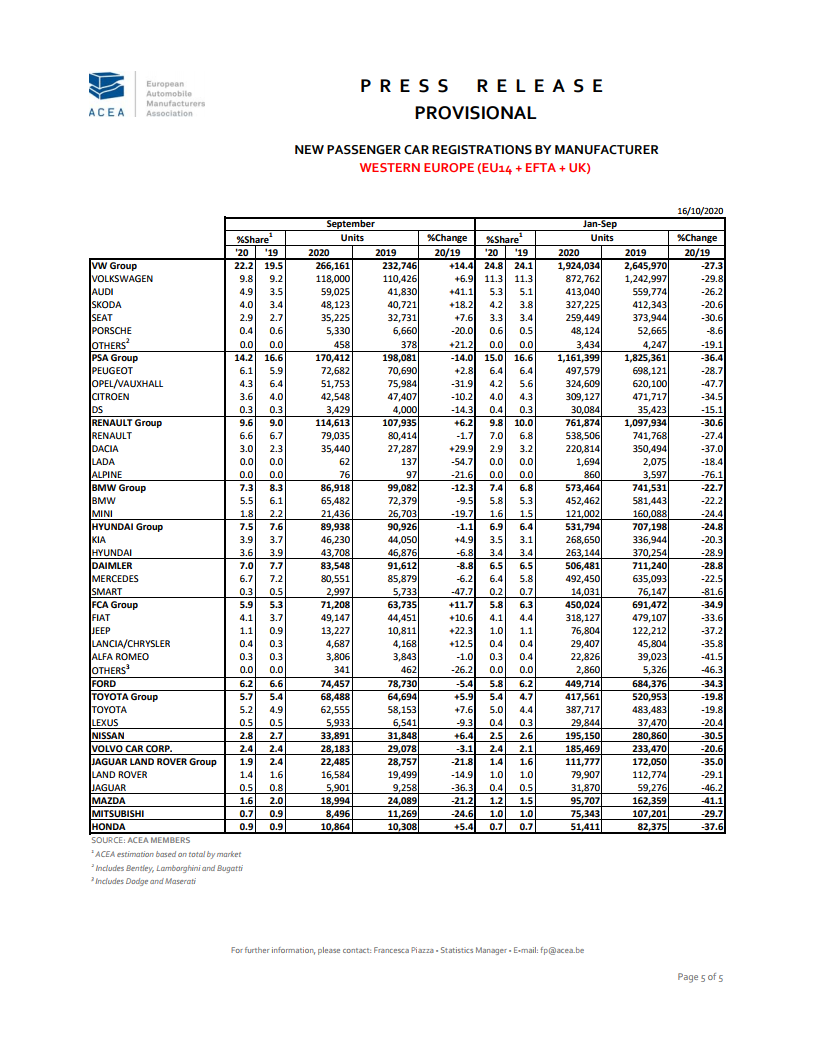 各大汽车制造商也喜忧参半,大众集团9月销量增长14.1%,雷诺销量增长8.1%,但标致雪铁龙集团销量下降14.1%,宝马下降11.9%,戴姆勒下降7.7%。
