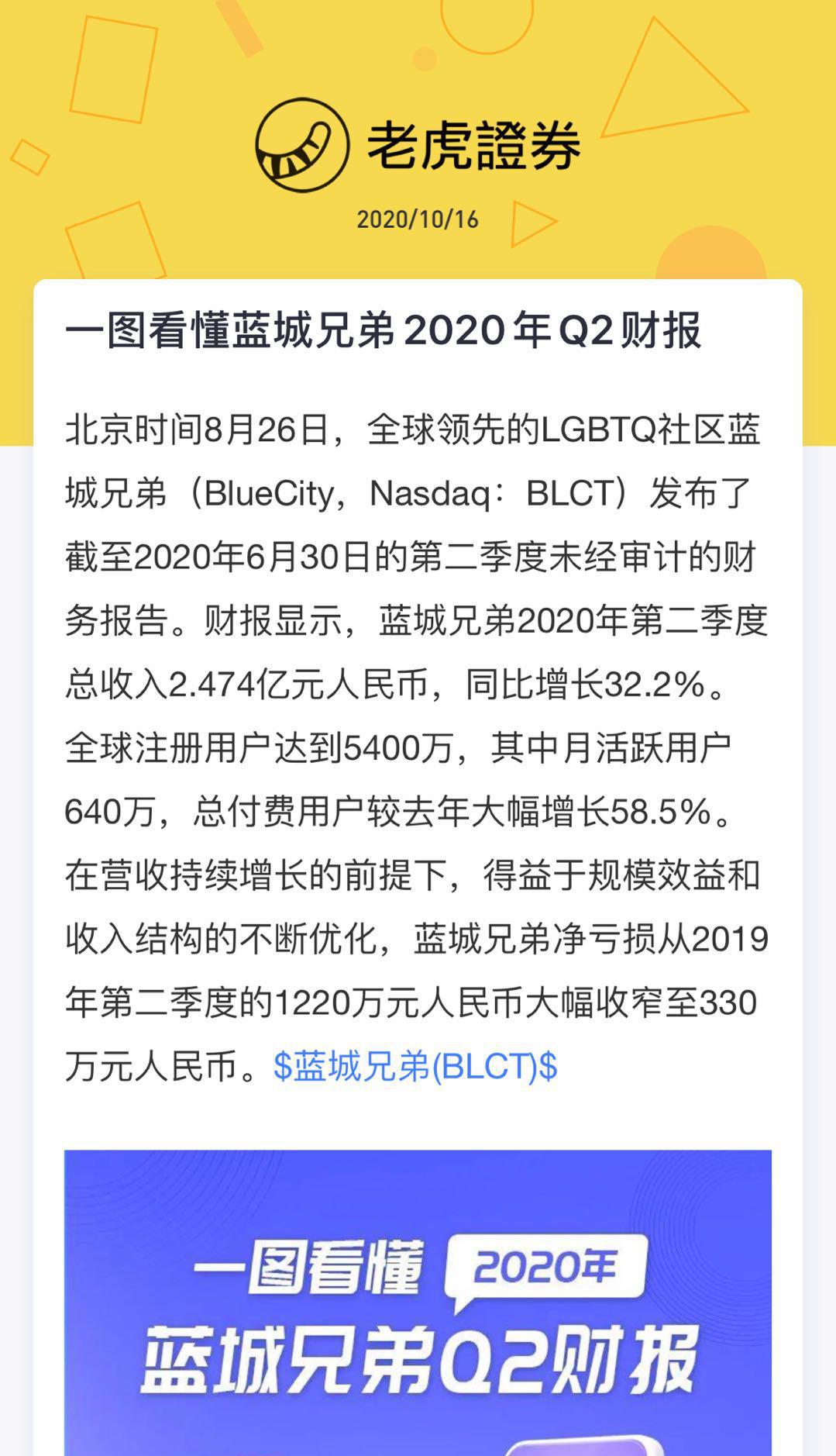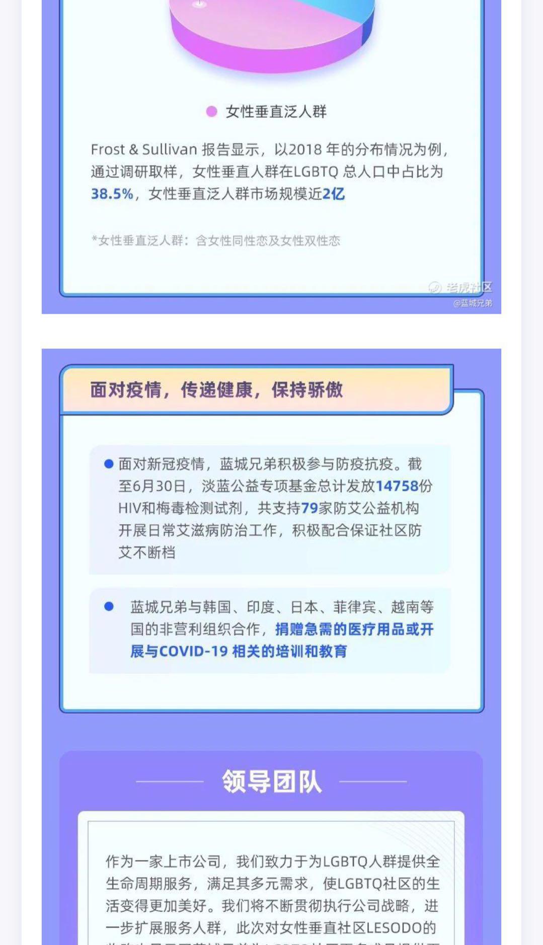 财报显示,截至2020年第二季度,其旗下产品已覆盖全球210多个国家和地区,用户达5400万。财报中还提到,蓝城兄弟在今年8月完成了对女性垂直社区“LESDO”的收购。这标志着蓝城兄弟正式入局女性垂直市场,进一步完善了LGBTQ人群全方位服务业务版图。