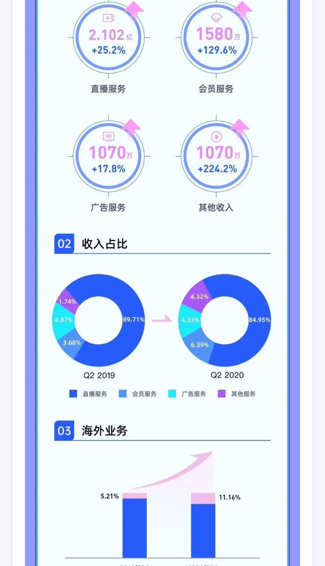 收入方面,得益于垂直社区化运营策略,蓝城兄弟2020年第二季度各项业务营收同比均有较大幅增长。其中,直播收入2.102亿元,同比增长25.2%;会员服务收入1580万元,同比增长129.6%;广告收入1070万元,同比增长17.8%;其他收入为1070万元,较去年同期的320万元大幅增长234.4%。