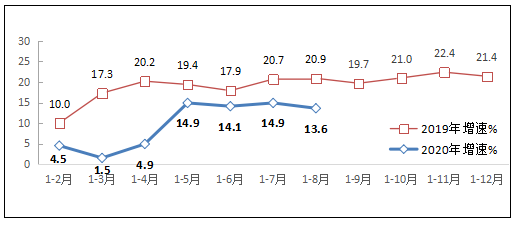 图1 2019-2020年1-8月互联网业务收入增长情况