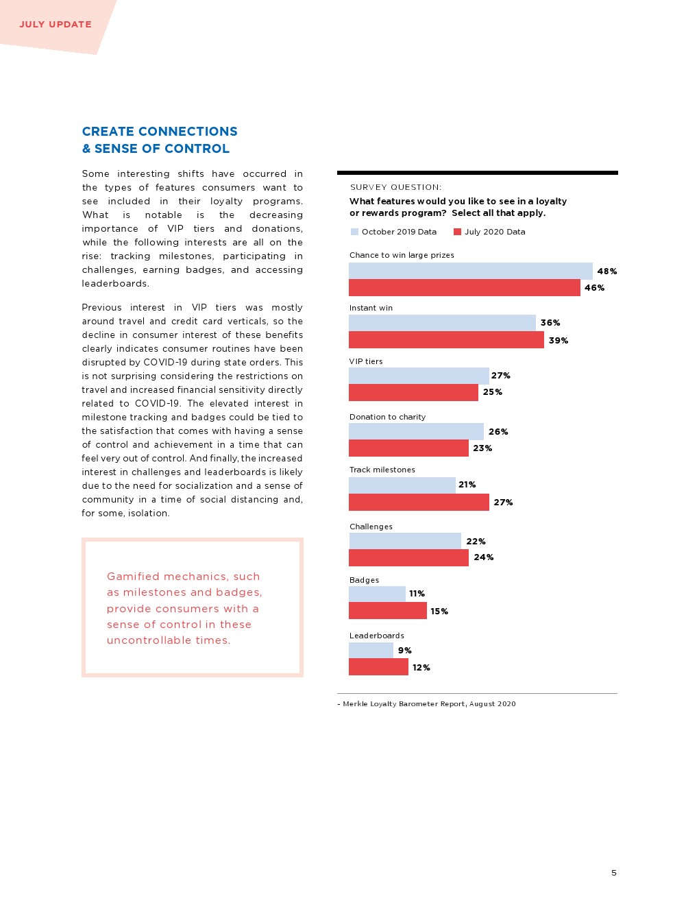 相反,消费者似乎对游戏化的功能更感兴趣,比如追踪里程碑(25%,高于此前的21%)、挑战(24% vs 22%)、徽章(15% vs 11%)和排行榜(12% vs 9%)。这些功能“在这些无法控制的时代为消费者提供了一种控制感。”