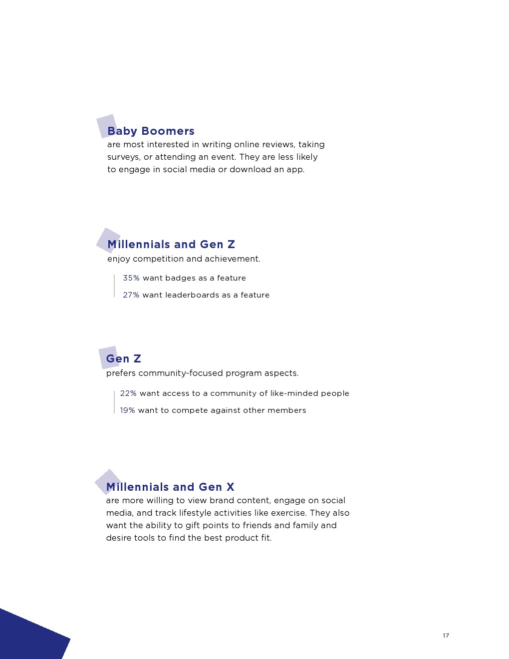 虽然消费者仍然认为以赚取积分的奖励计划最具吸引力,但在消费100美元时获得10美元奖励的计划已经上升了一位,排在第二位。此外,排名上升到第三位的是每周一为消费者提供新的奖励计划。让参与者在更多的零售商那里购物后获得积分的计划的吸引力从第二位下降到第四位。对消费者最不具吸引力的计划是参与后会获得惊喜奖励。