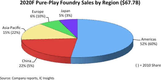 日本仍将是最小的纯代工市场,今年的市场份额仅为5%(仅比2010年上升2个百分点)。鉴于日本2020年的代工市场预估价值约为36亿美元,预计日本在芯片代工市场的份额约为2020年美洲芯片代工市场规模(351亿美元)的10%。