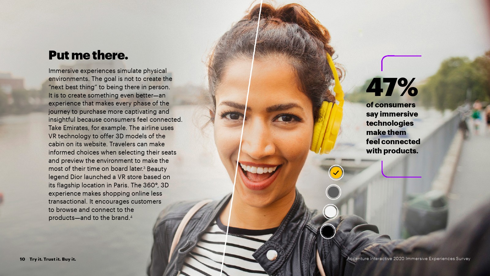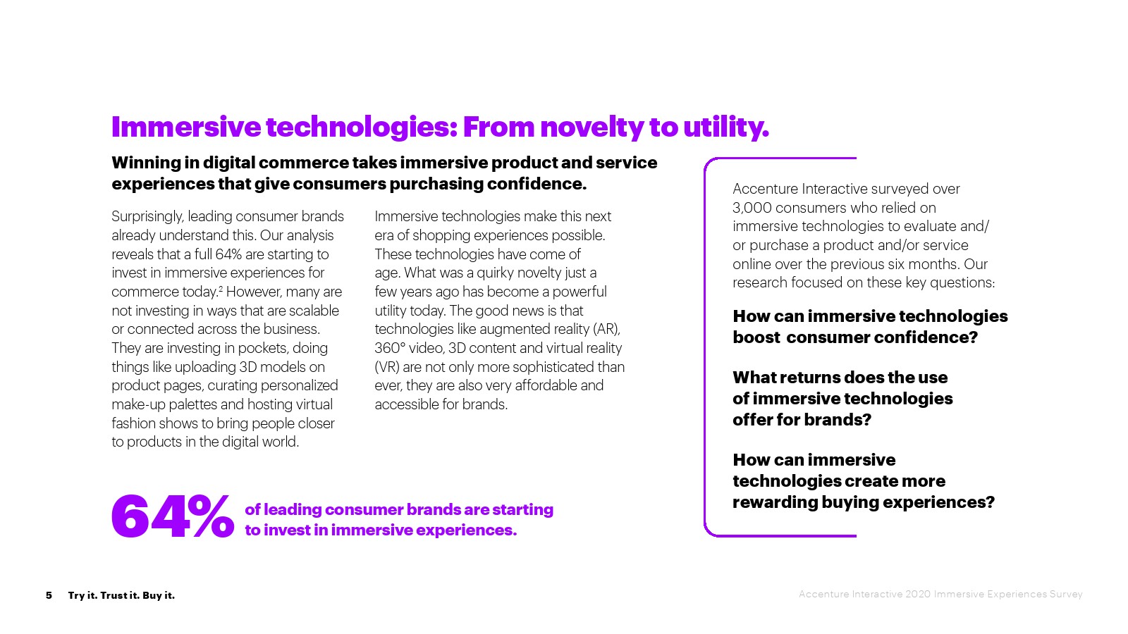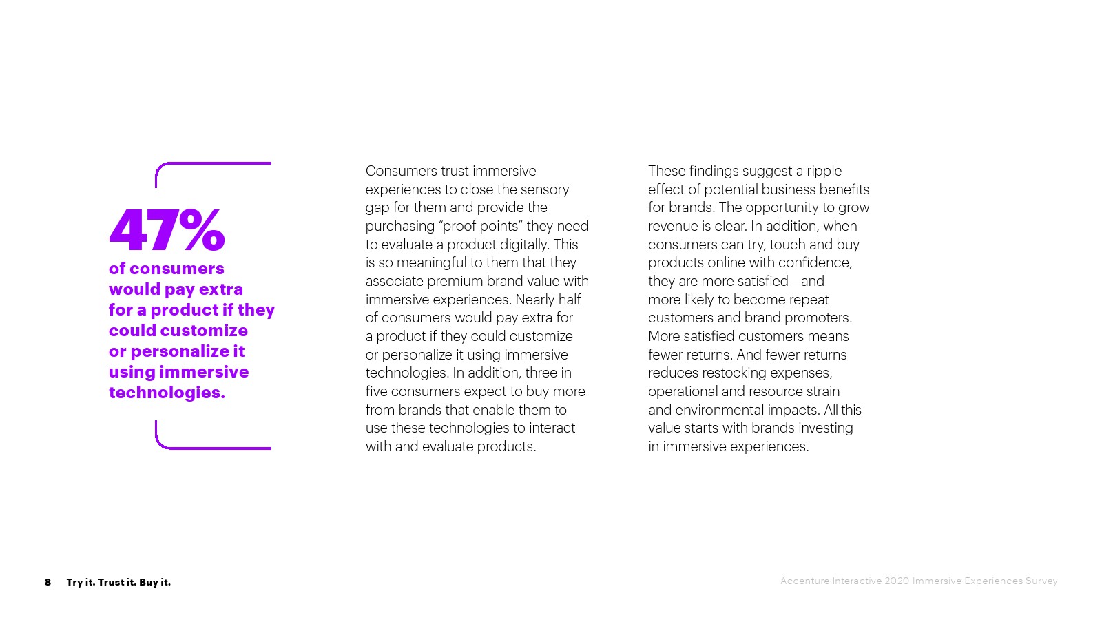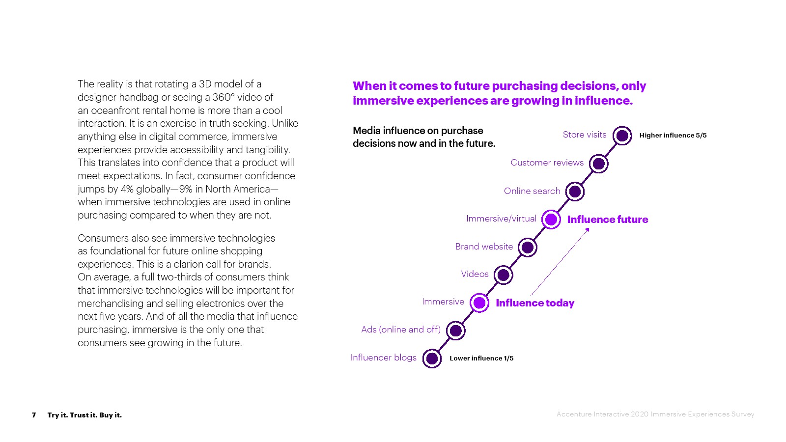 去年,GfK的一项调查发现,只有1/4的消费者预计在未来购物体验中会尝试AR/VR技术。但是,沉浸式技术的未来看起来很光明。埃森哲的调查显示,消费者认为沉浸式和虚拟技术将对未来的购买决策产生更大的影响。