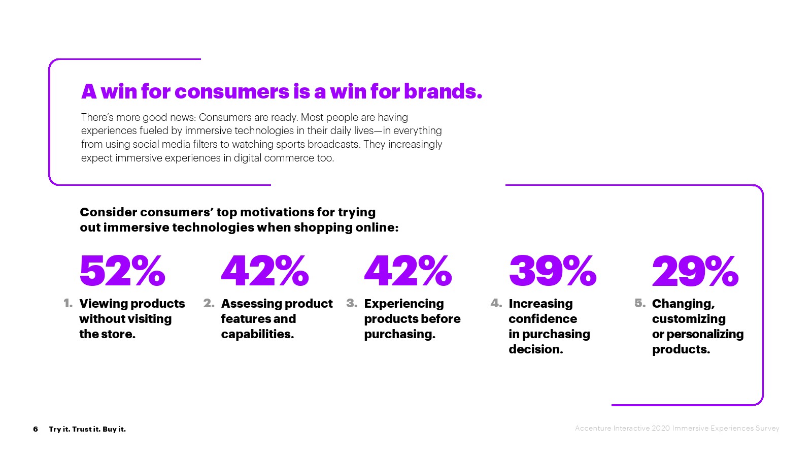 过去6个月里埃森哲对3000多名依赖身临其境技术在网上评估和/或购买产品或服务的消费者进行的调查显示,在网上购物时尝试这些技术的最大动机之一是能够在不去商店的情况下查看产品(52%)。约42%的消费者还将评估产品特性和功能列为首要动机;同样比例的受访者认为是在购买前体验产品(42%)。另有39%的受访者表示,这些技术让他们对购买决定的信心不断增强。