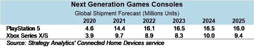 Strategy Analytics的研究预测,到2020年底,全球PS5的出货量将达到460万台,而Xbox的X / S将为390万台。 Xbox Series X / S出货量将在2024年达到顶峰为1000万台,而PS5则将在2023-24年达到1650万顶峰。