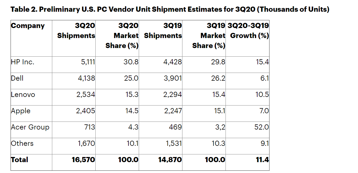 惠普的增长低于市场平均水平,台式机出货量在2020年第三季度仅增长0.7%。