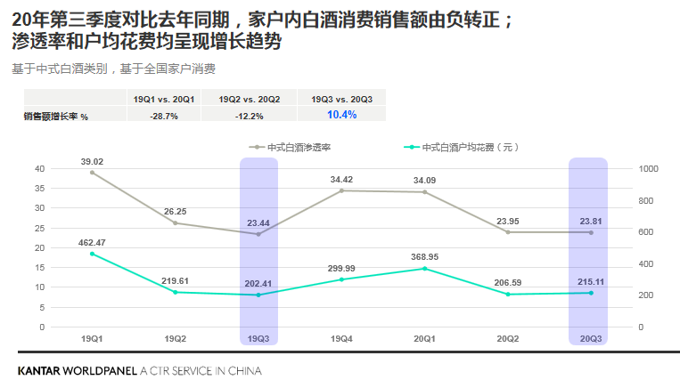虽然到了第三季度,中秋国庆双节的到来带动了白酒消费销售额由负转正,但是从长远来看,消费者的消费价值观和购买方式因为疫情而发生了重要转向,这也意味着白酒品类所面临的挑战正在增加。