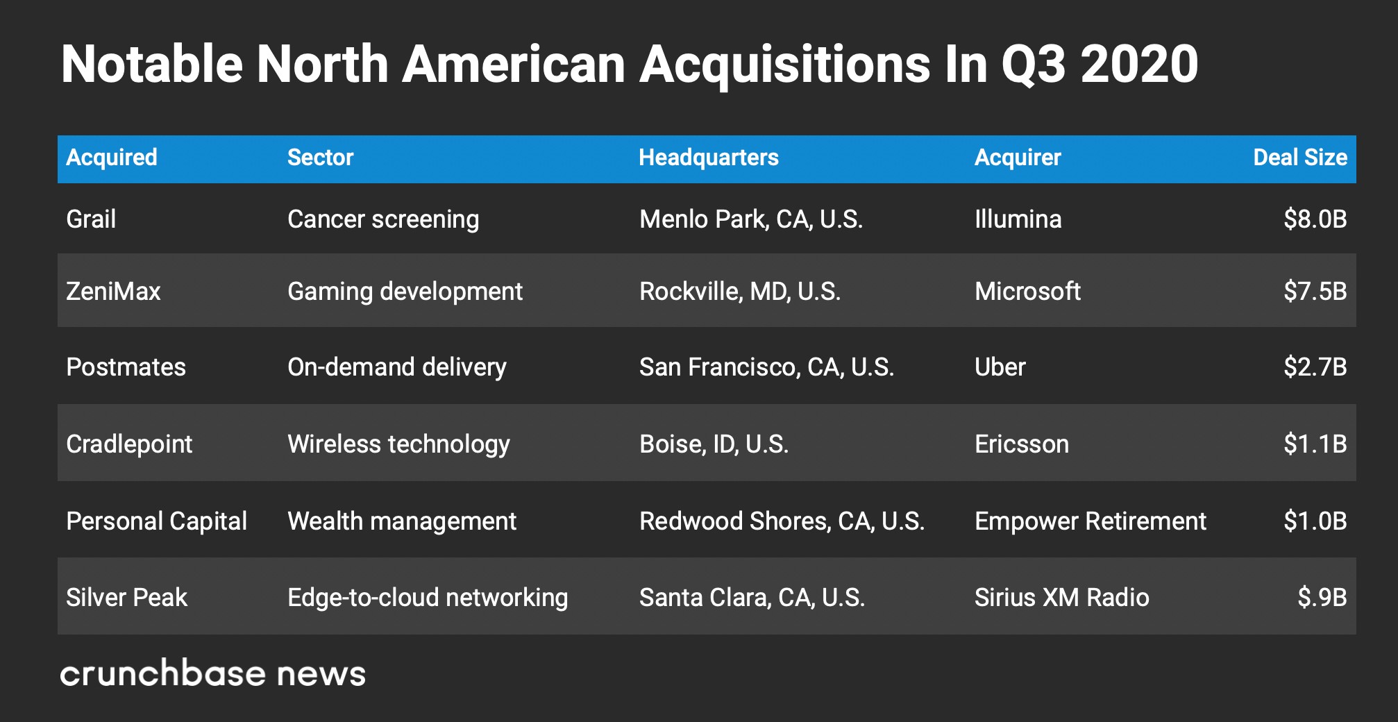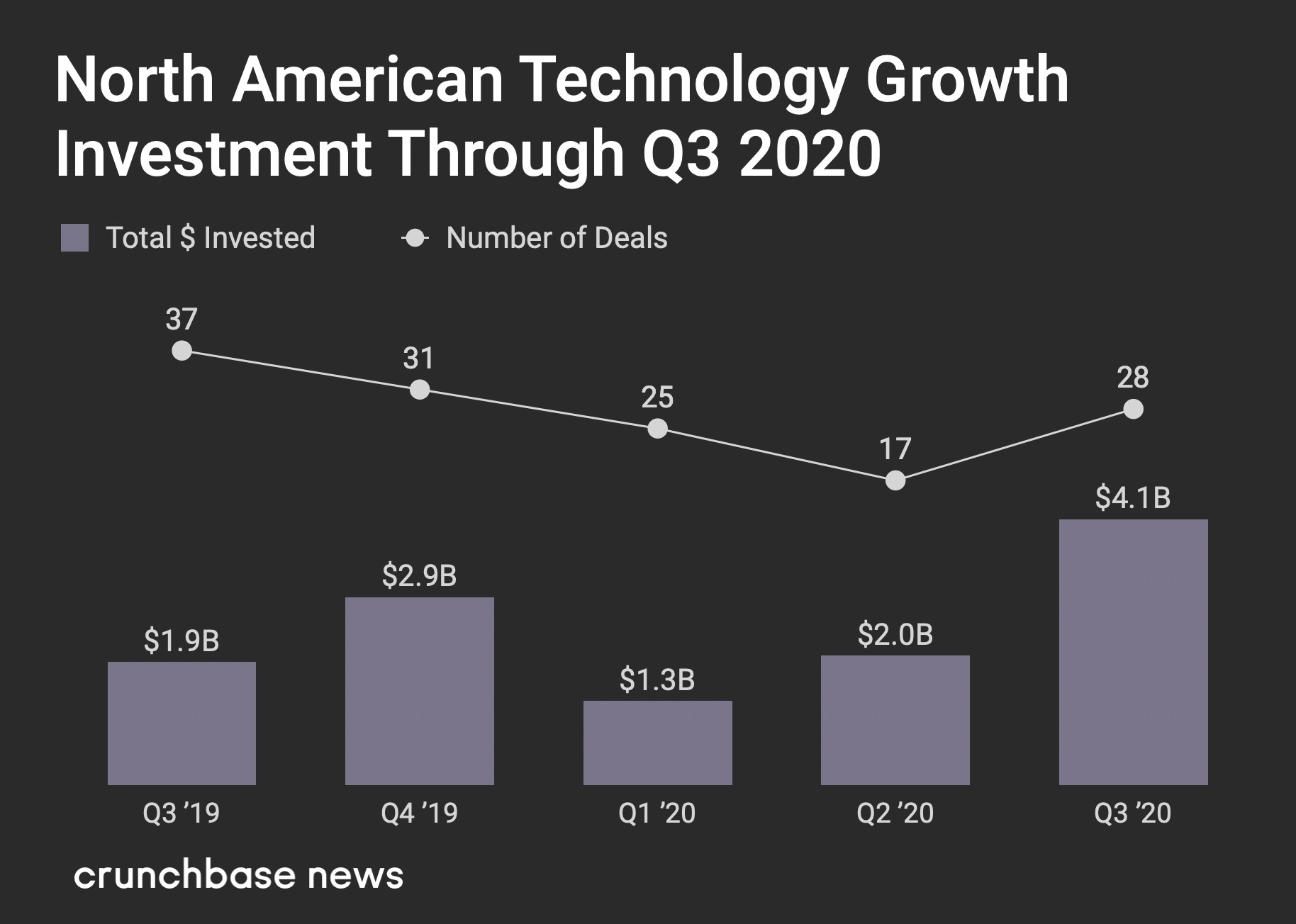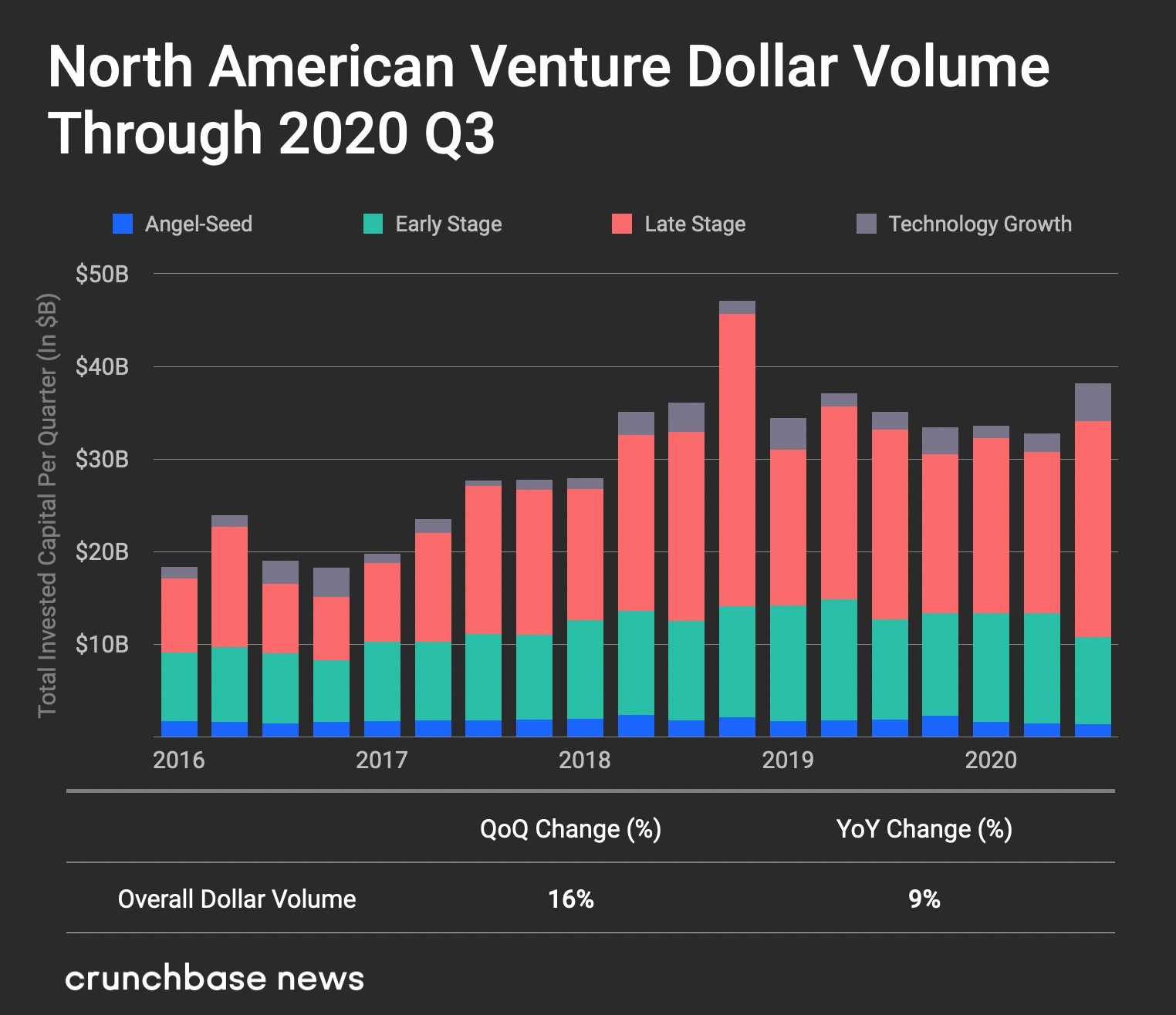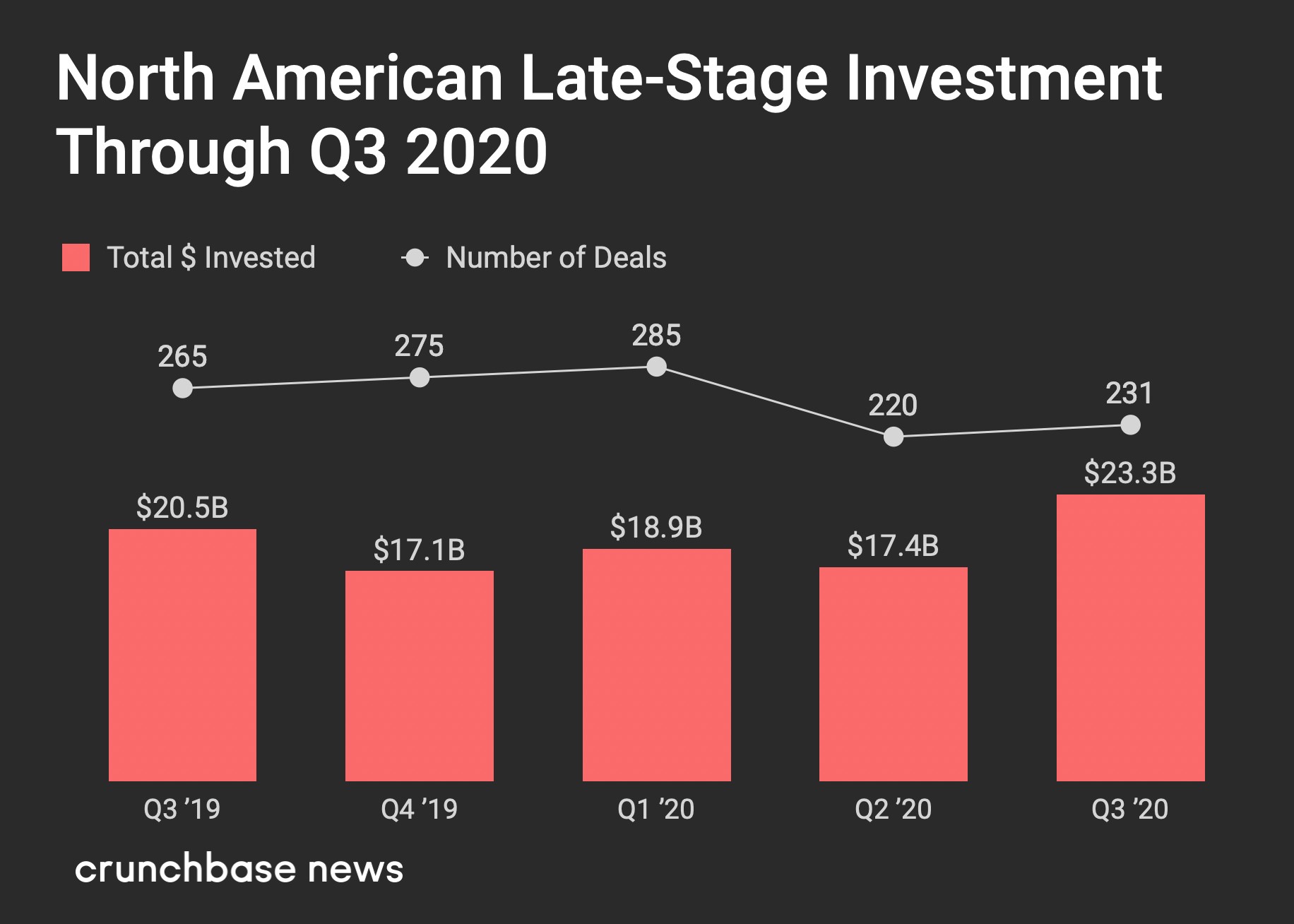 2020年第三季度,投资者在228笔后期交易中投入了211亿美元;这是过去五个季度投资总额最高的一个季度。
