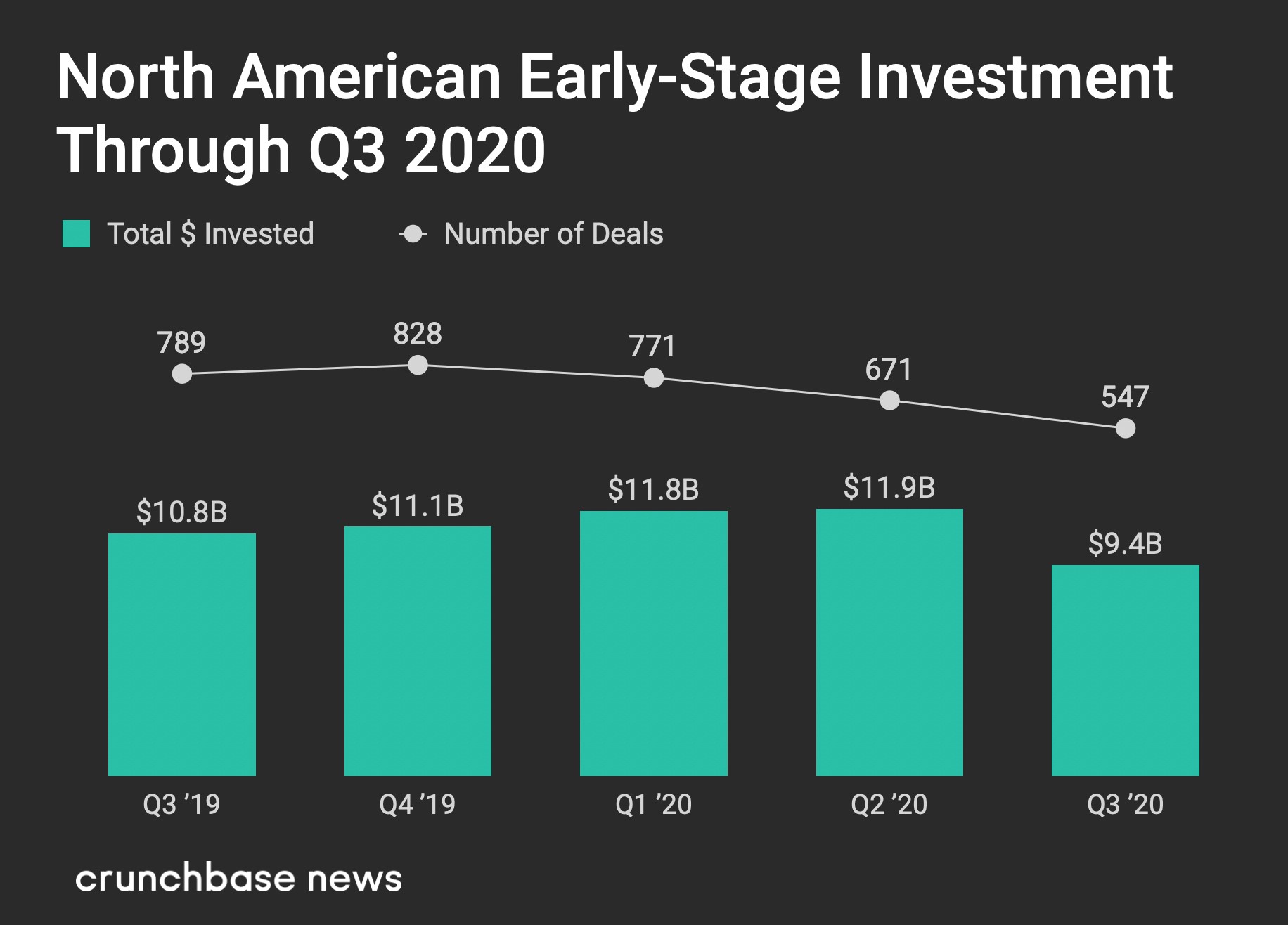 第三季度共完成526笔早期阶段投资,交易额920万美元。这低于第二季度的119亿美元和2019年第三季度的108亿美元。