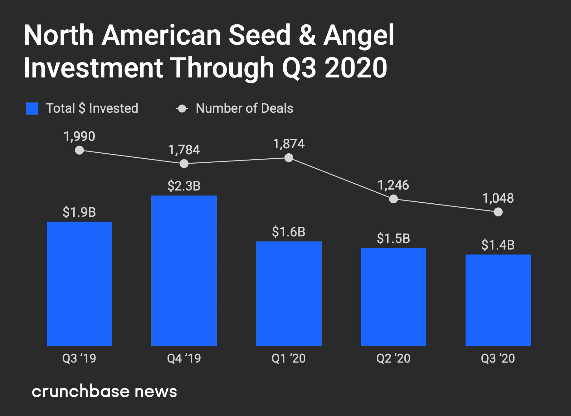 北美种子阶段的交易在第三季度也表现良好,根据Crunchbase的初步数据,1048笔种子交易共融资14亿美元。
