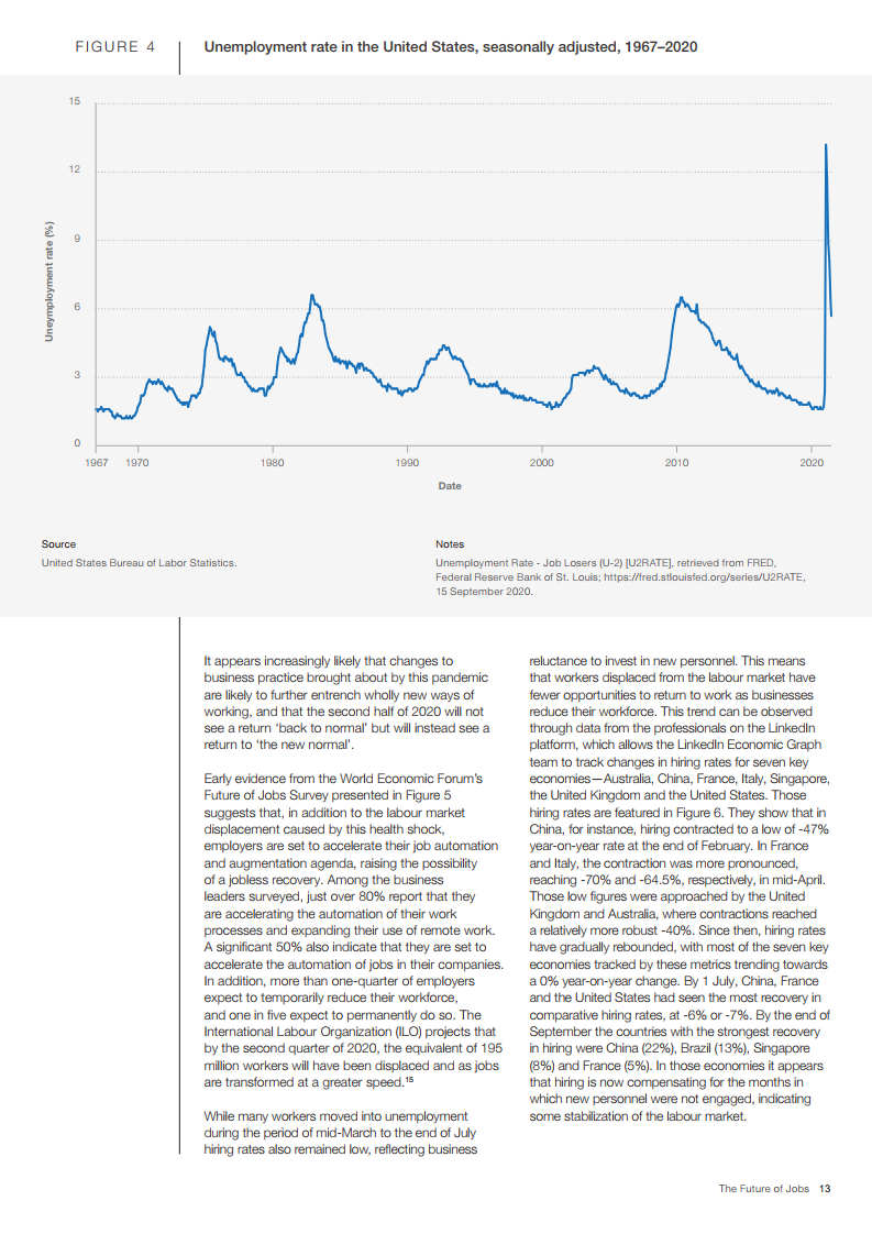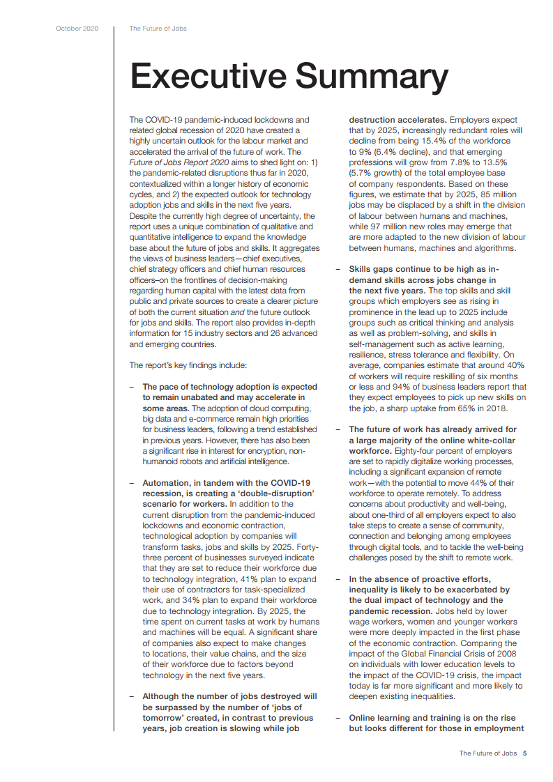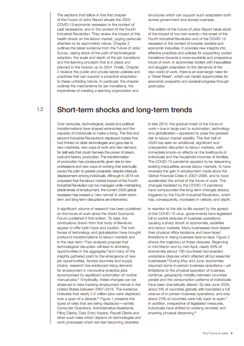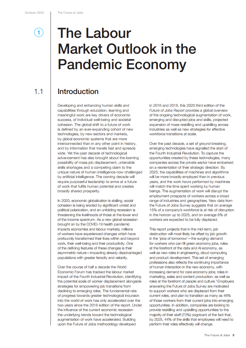 世界经济论坛《2020年未来就业报告》说,新冠疫情导致的经济衰退和不断加速的自动化将促使就业市场的变革速度远超预期。