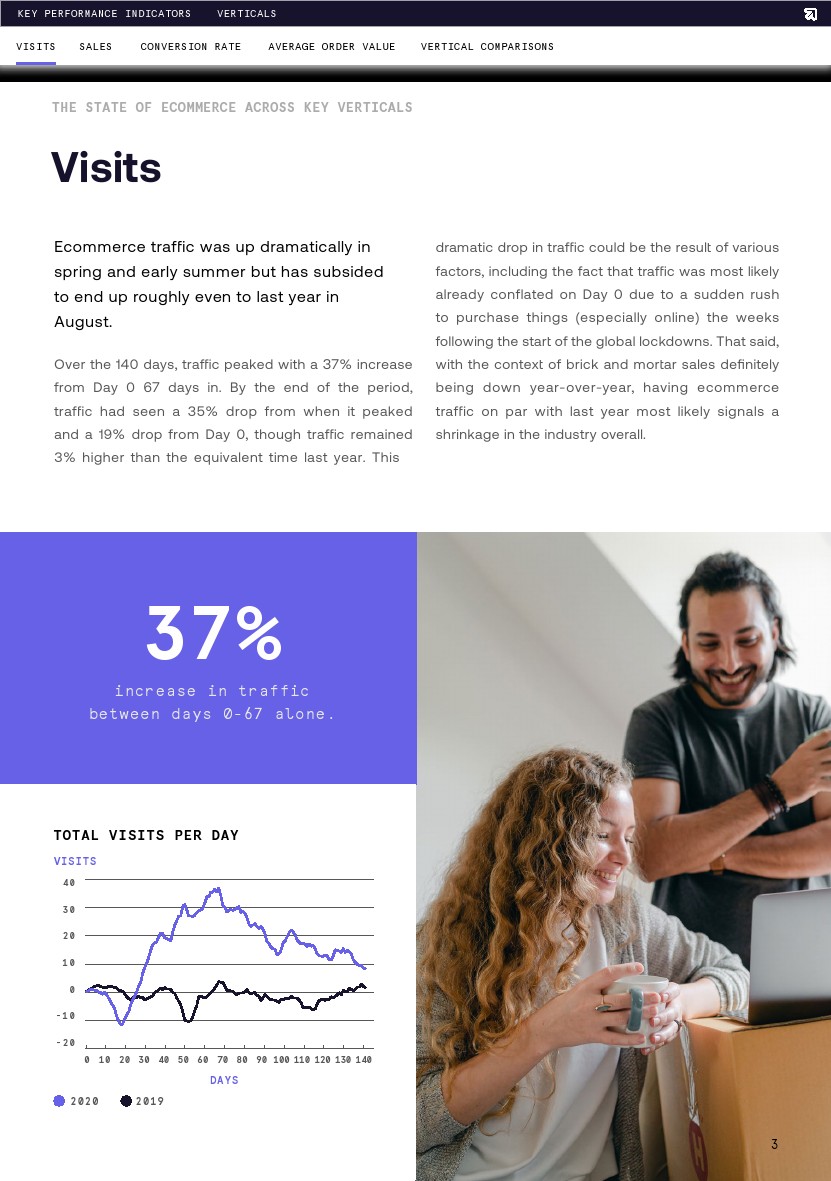 在过去的140天里,电子商务流量达到了顶峰。第67天比第1天增长了37%。到这段时间结束时,流量比高峰时下降了35%,比第1天下降了19%,但是流量仍然比去年同期高出3%。