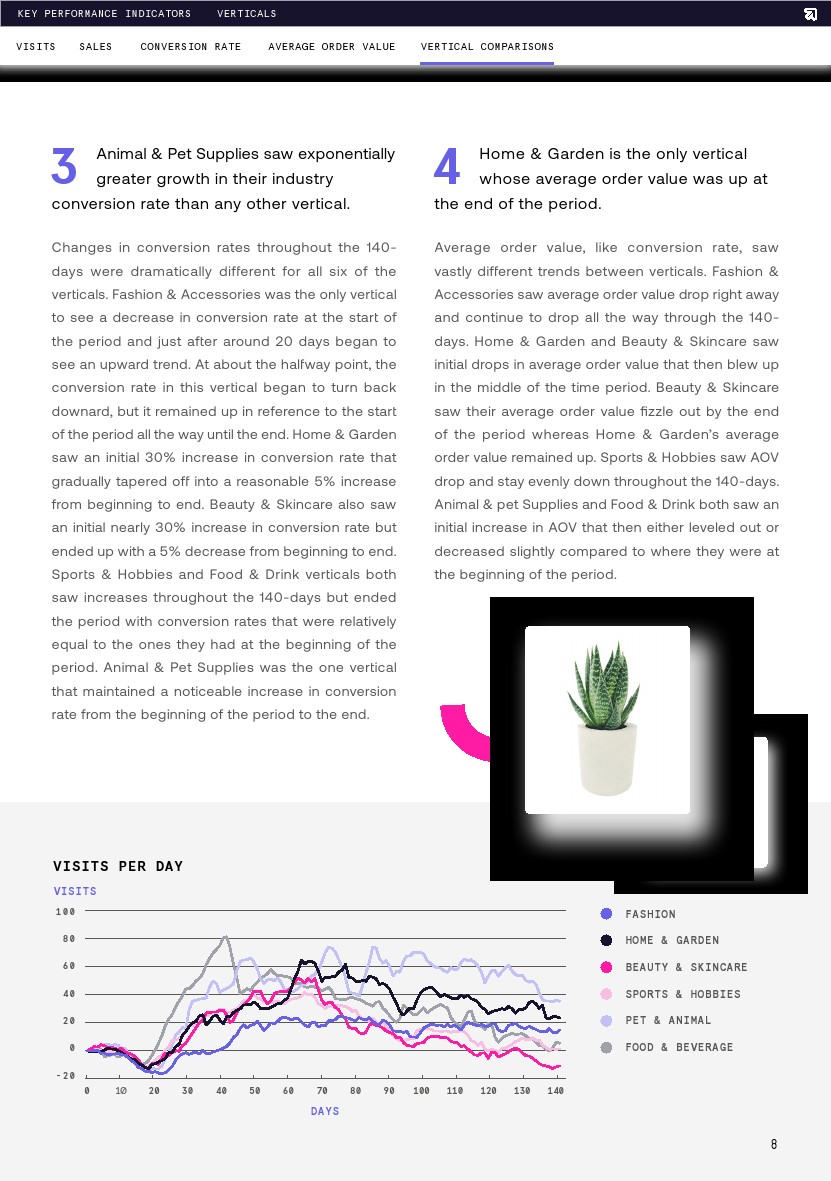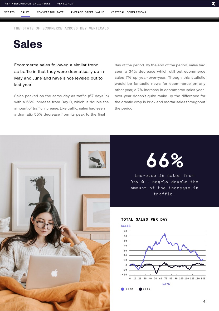 销售额与流量在同一天达到顶峰(第67天),比第1天增长66%,是流量增长率的两倍。与流量一样,从高峰到最后一天,销售额也出现了55%的戏剧性下降。到调查期结束时,销售额已经下降了34%,但这仍然比去年同期增长了7%。