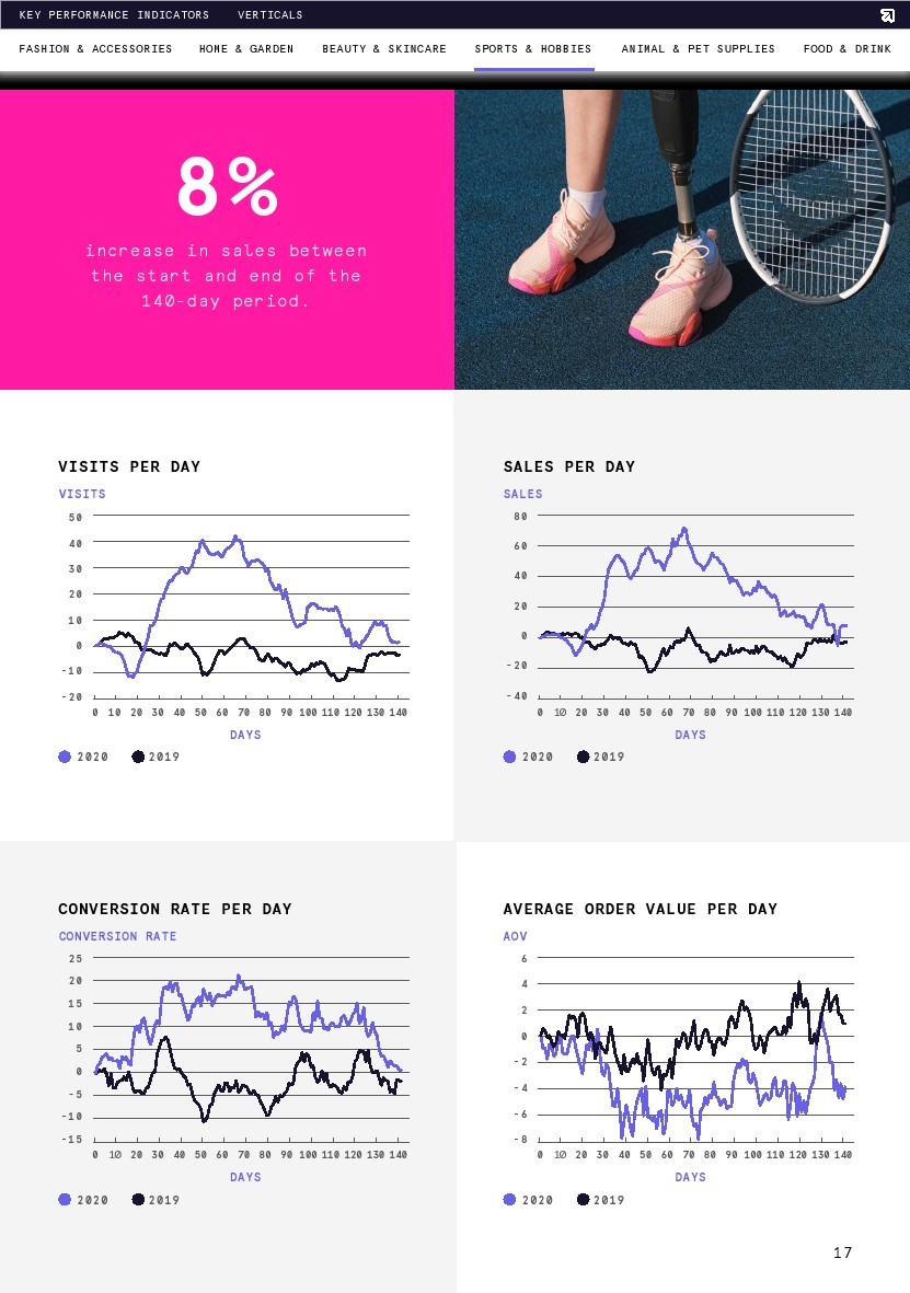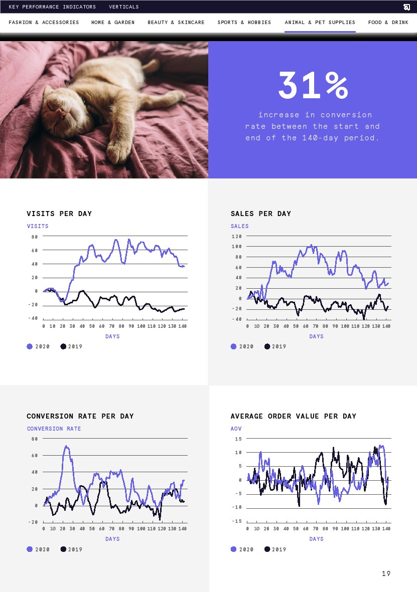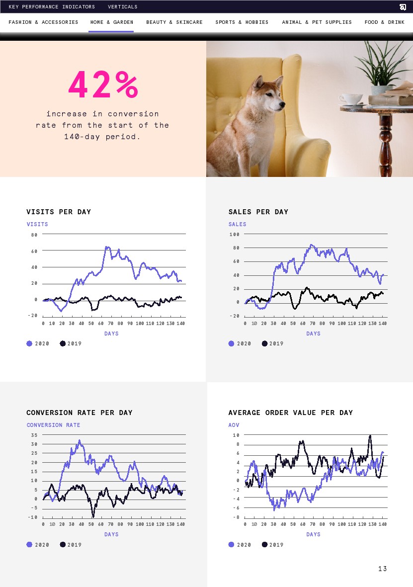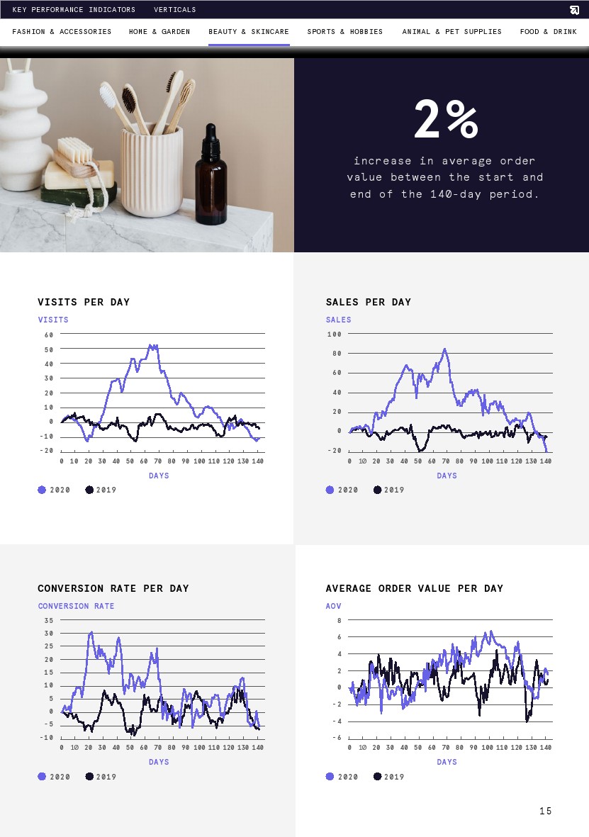 转化率与去年同期相比稳定上升,但从期初到8月1日略有下降(-6%)。转化率在第13天达到了最大增幅(20%),恰好也是这一时期的最高点(比第1天增长4%)。调查结束时的平均转化率比去年高出6%,这意味着要么是购物者在网上商店浏览时意向更高,要么是网络零售商在转化购物者方面做得更好。