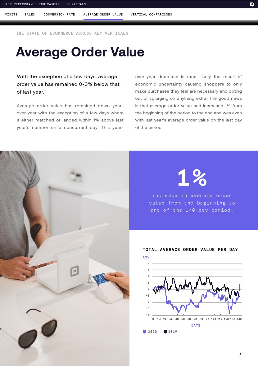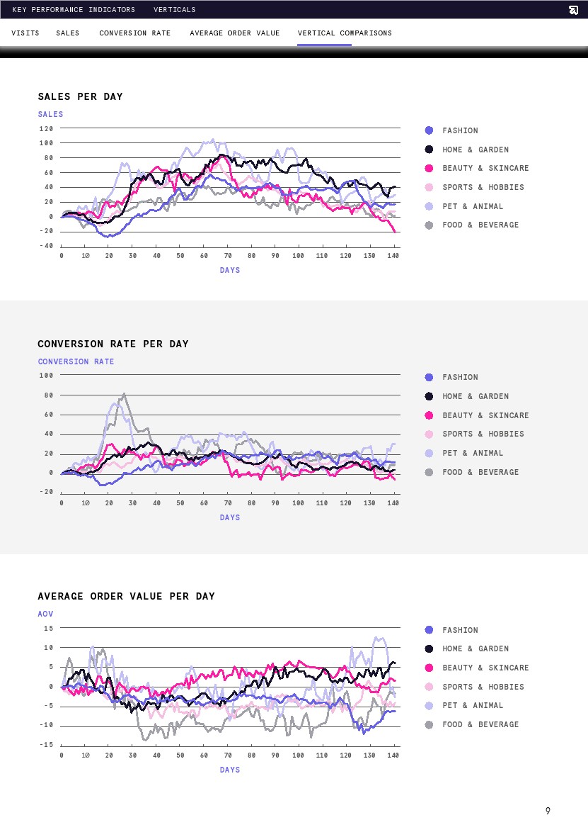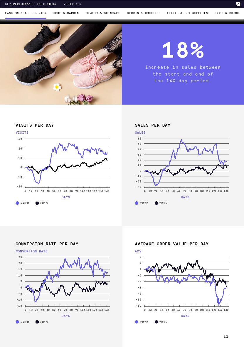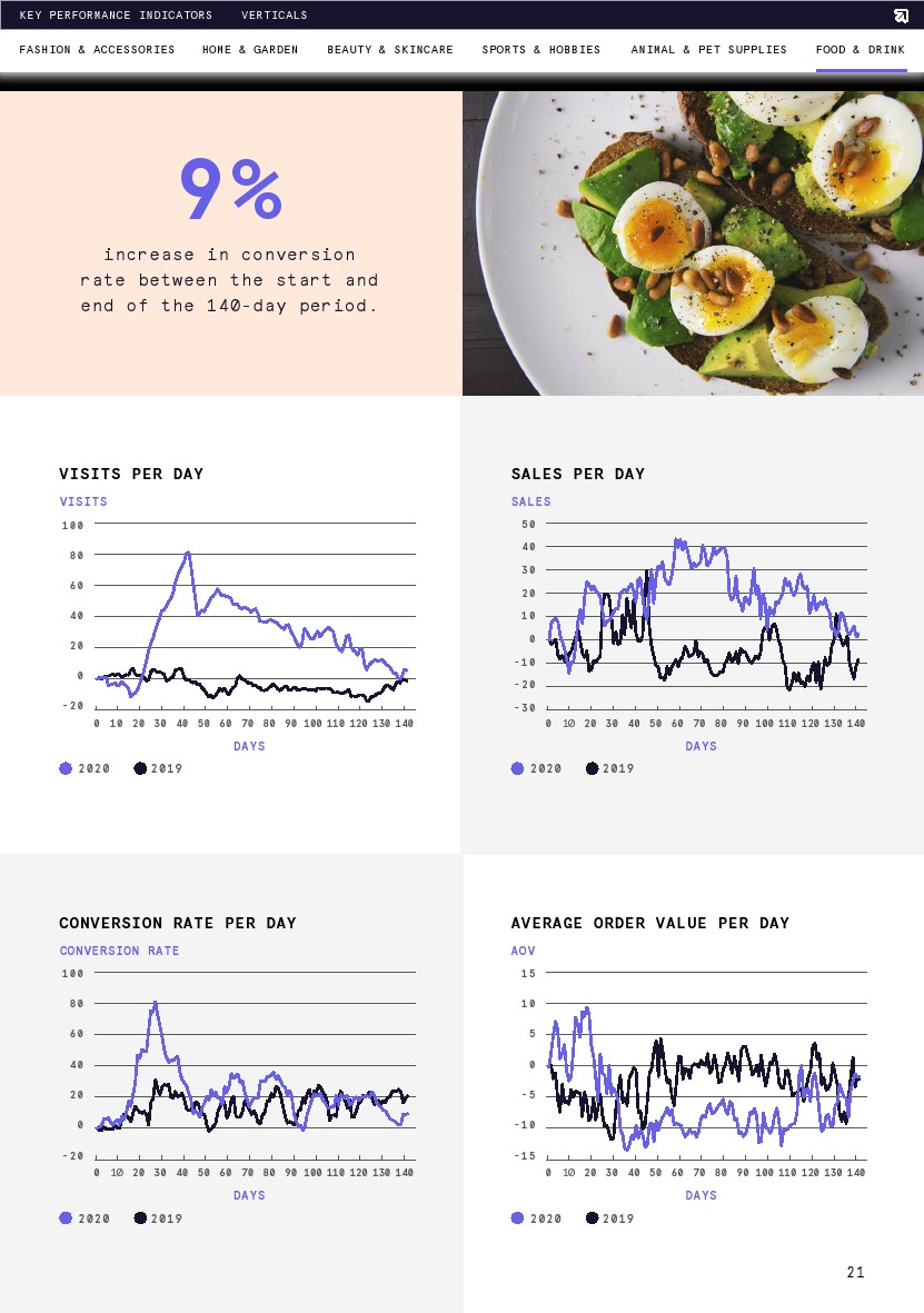 转化率与去年同期相比稳定上升,但从期初到8月1日略有下降(-6%)。转化率在第13天达到了最大增幅(20%),恰好也是这一时期的最高点(比第1天增长4%)。调查结束时的平均转化率比去年高出6%,这意味着要么是购物者在网上商店浏览时意向更高,要么是网络零售商在转化购物者方面做得更好。