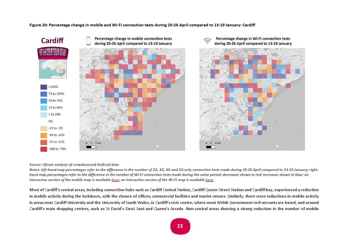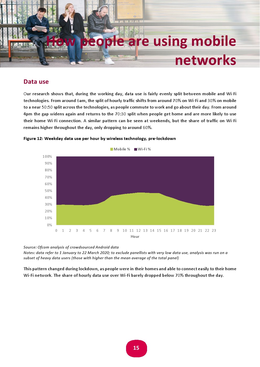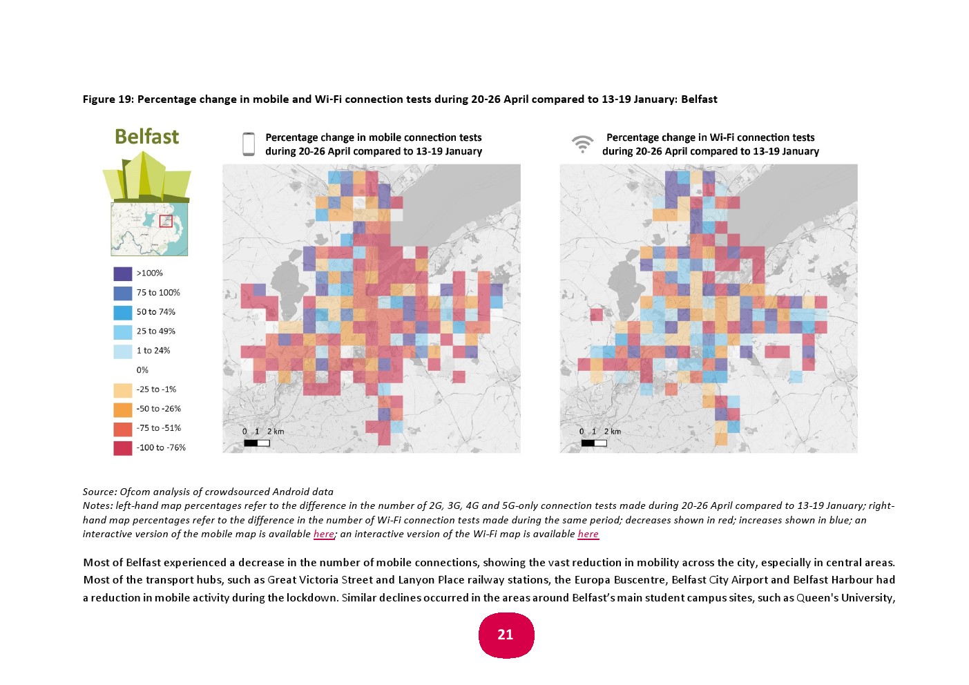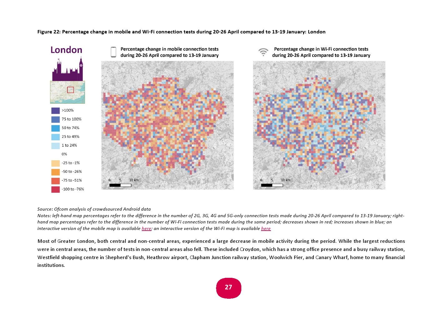 - 封锁还导致英国首都城市中心地区的移动设备使用量大幅减少,因为人们不再通勤到这些地区,转而在家工作。这些人更可能通过Wi-Fi连接到网络。