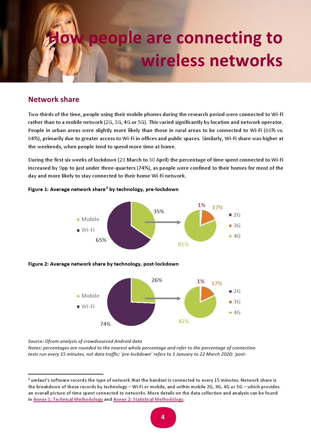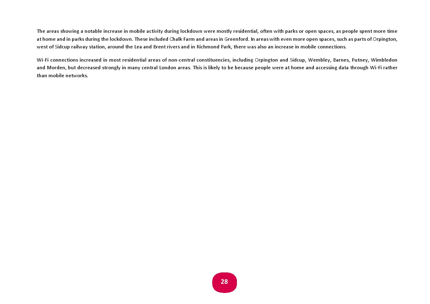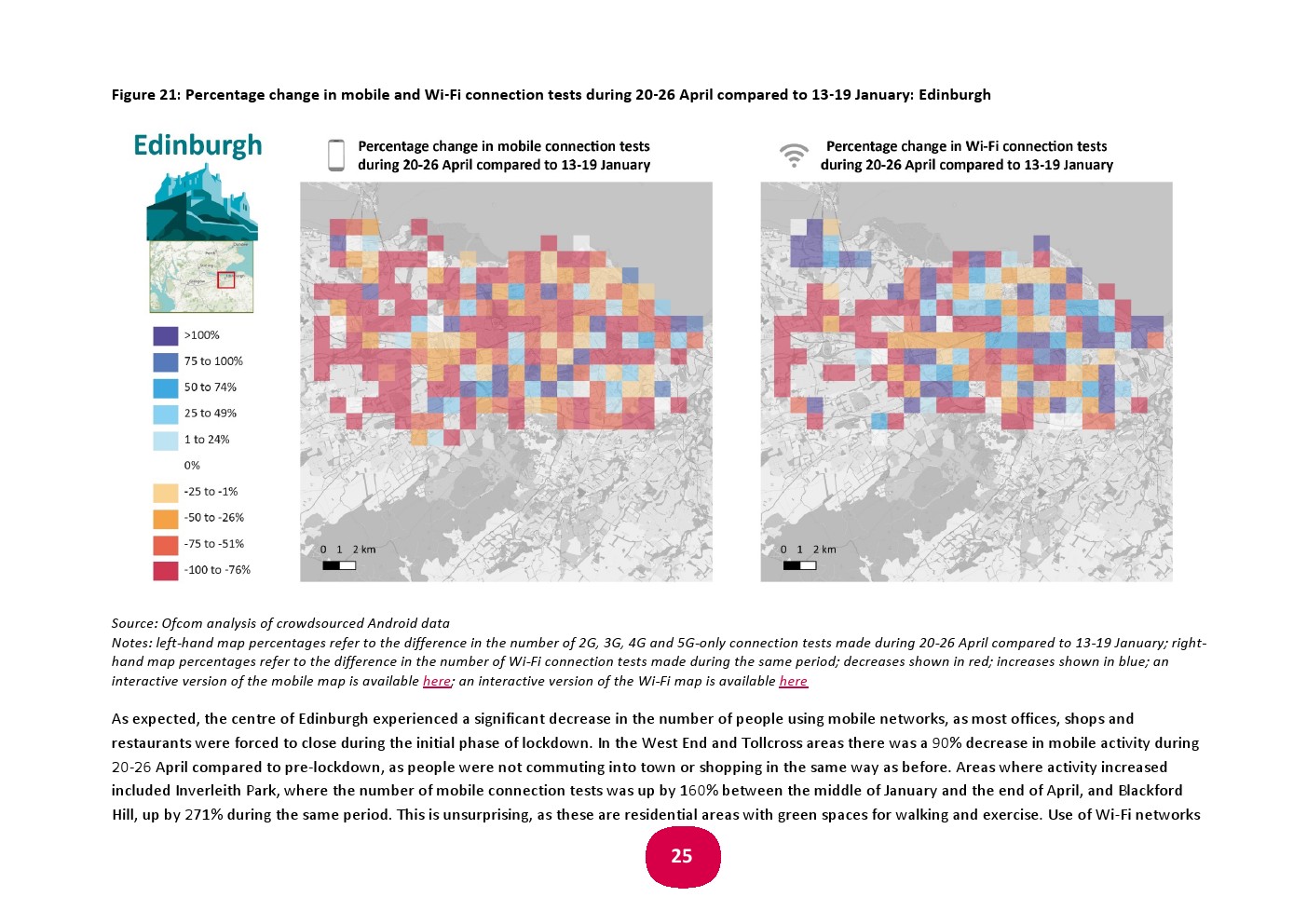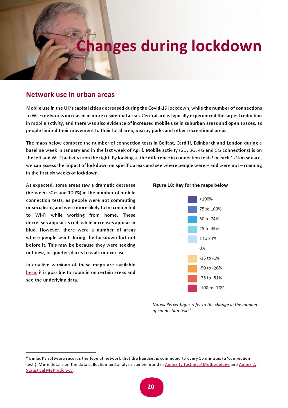 - 封锁还导致英国首都城市中心地区的移动设备使用量大幅减少,因为人们不再通勤到这些地区,转而在家工作。这些人更可能通过Wi-Fi连接到网络。