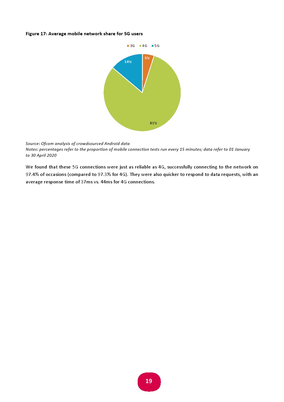 报告中Ofcom重点关注无线网络技术(2G、3G、4G、5G、Wi-Fi)的连接份额、移动连接成功率、响应时间以及人们使用手机的方式。Ofcom还研究这些因素是如何随位置、一周中的每一天和一天中的不同时间而变化的。