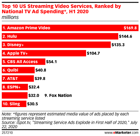 亚马逊是最大的广告主,2020年上半年亚马逊Prime Video的电视广告投资达1.698亿美元。其他几家流媒体服务也依赖于电视广告来宣传自己。迪士尼利利用数十亿的广告展现来推广迪士尼+和Hulu。