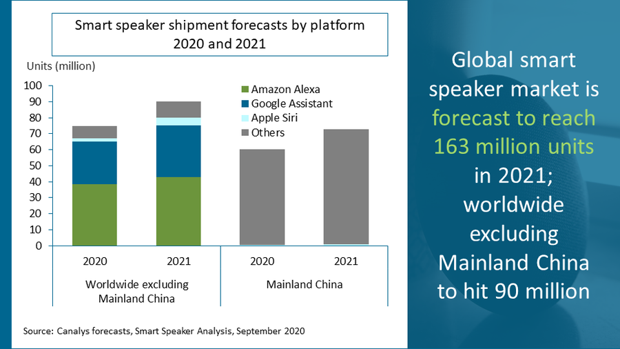 Canalys的最新预测显示,到2021年全球智能音箱市场将达到1.63亿台,增长21%。2020年,中国大陆以16%的增长率领先,预计其余市场将增长3%。