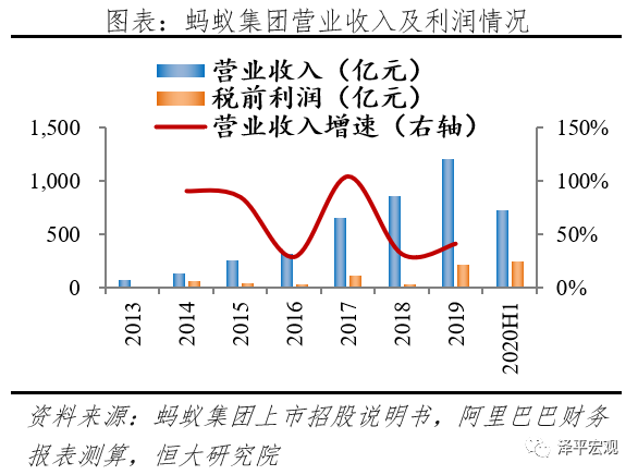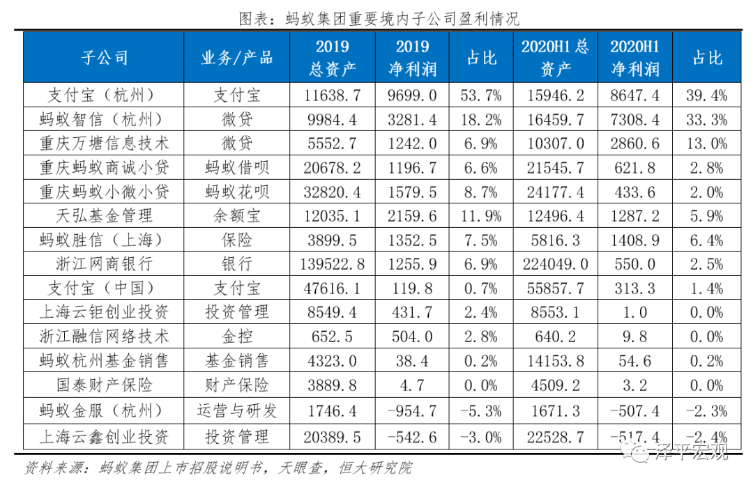 理财业务的经营主体主要是天弘基金和蚂蚁(杭州)基金销售。其中,天弘基金2019年和2020年上半年贡献净利润21.6亿元、12.9亿元,占比11.9%、5.9%。