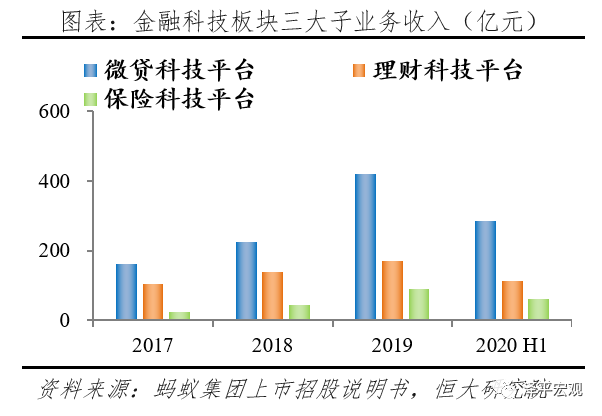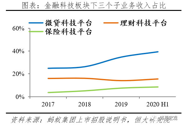 数字金融科技平台贡献收入64%,网络借贷占比高。此板块为多元金融服务,以交易佣金、利息收入、投资收益等作为主要收入,2017-2020上半年营业收入分别289.9、406.2、677.8、459.7亿元,占比从44.3%增长至64.4%,是蚂蚁最大的收入来源。下设微贷科技平台、理财科技平台和保险科技平台,2020年上半年收入占比分别为39%、16%、8%。
