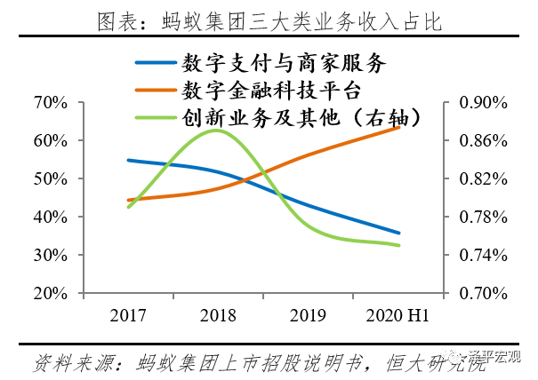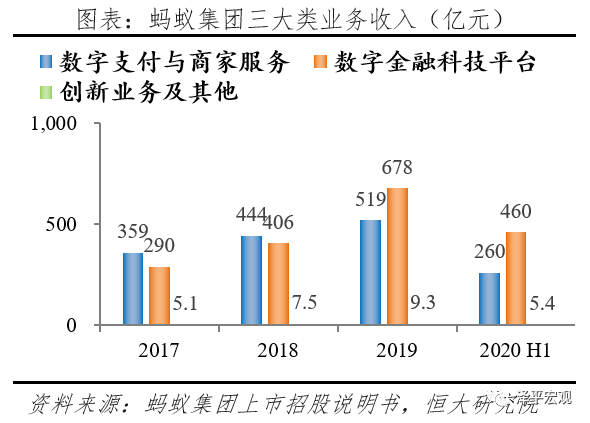 当前蚂蚁集团着力布局三大战略板块,数字支付与商家服务、数字金融科技平台、创新及其他业务。