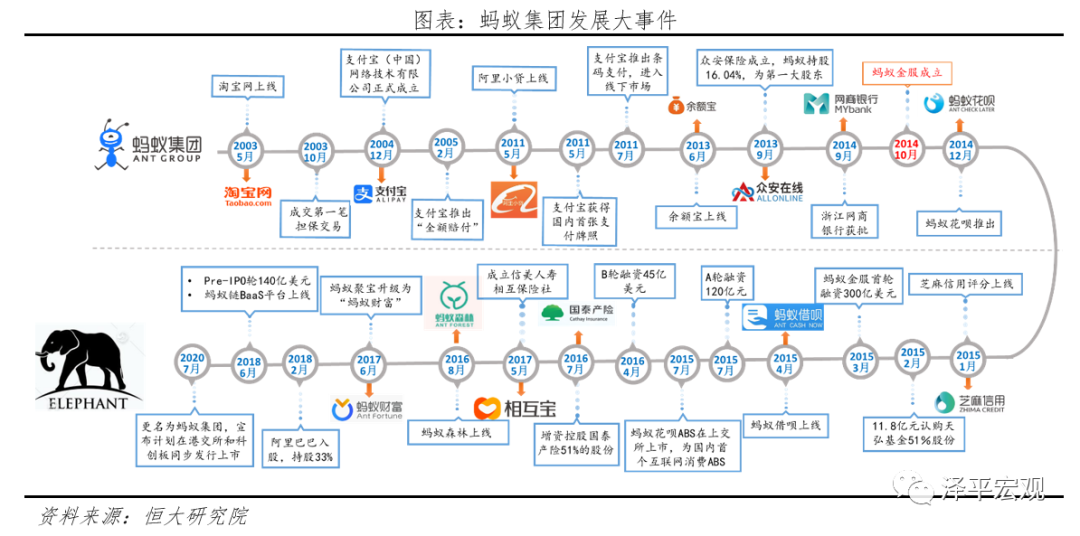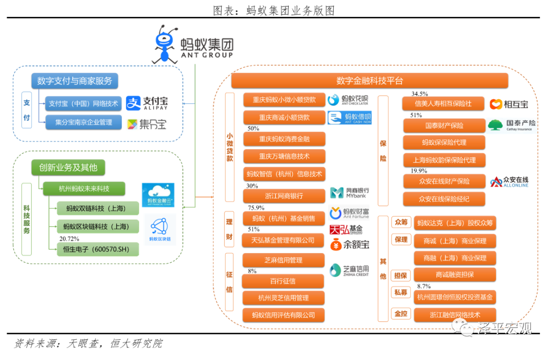 颠覆金融(2012-2016):以普惠金融切入,牌照为王,流量变现。凭借庞大的阿里电商生态与早期流量积累,蚂蚁开始将业务延伸至信贷、理财、保险等传统金融领域。理财:2012年5月支付宝获得基金销售支付牌照,2013年6月支付宝与天弘基金合作推出“余额宝”,同年10月支付宝以11.8亿元认购了天弘基金51%的股份;信贷:2014年6月蚂蚁金服正式成立,2014年9月浙江网商银行获批,主营小微信贷、供应链金融等业务;2015年蚂蚁花呗和蚂蚁借呗等爆款产品先后上线,芝麻信用正式投入使用,拓宽了互联网信贷领域的布局;保险:2016年蚂蚁金服向国泰产险增资,持股51%,2017年成立信美人寿相互保险社,保险业务开始在蚂蚁金服的版图中落地开花。这一阶段,蚂蚁金服渗透到传统金融领域,获取银行、保险、保险经纪、公募、基金销售、私募、保理、小贷等共8类牌照,旗下有超过20家金融机构。