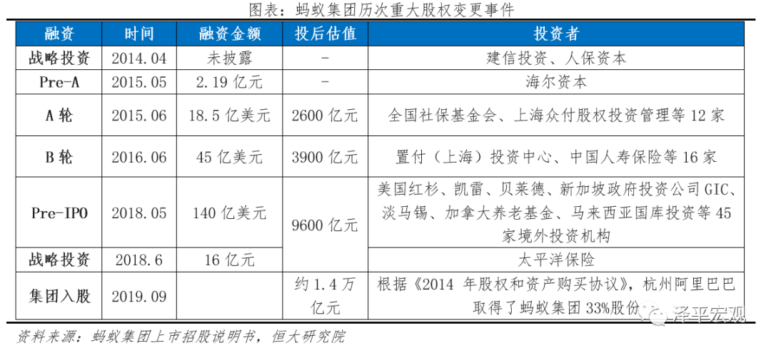 蚂蚁共经历三轮大型的融资,另有五次小型的融资。2015年6-8月,蚂蚁集团A轮融资共募集资金18.5亿美元,市场估值超过2600亿元,引入战略投资者多为保险相关,包括全国社保基金会、中国人寿、太平洋人寿、人保资本等,另有上海金融发展投资基金、国开金融等实力雄厚的机构;B轮融资在2016年5月,本轮共募集资金45亿美元,投后估值达到3900亿元,本轮引入建信信托、中金甲子等机构;Pre-IPO轮融资以引入境外资金为主,共募得境外资金103亿美元,境内资金37亿美元,美国红杉、凯雷、贝莱德、新加坡GIC、淡马锡、加拿大养老基金、马来西亚国库投资等著名投资机构均在列,投后估值高达9600亿元,成为全球最有价值的独角兽。