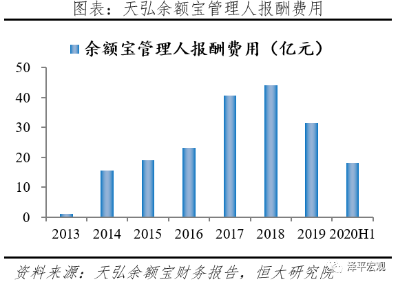 收益:1)显性收益来自为天弘基金等提供直销平台的手续费。余额宝按照促成金融机构合作伙伴实现资产管理规模的一定百分比收取技术服务费,成立当月规模达到42.4亿元,至2020年6月末,余额宝规模翻了近三百倍达到12238.1亿元。2)打开与金融机构合作前景。天弘余额宝基金支付的关联人报酬费用从2013年的1.04亿元增长至2019年的31.49亿元,巨大潜力吸引其他金融机构参与,为平台开放奠定基础。3)拉开互联网金融序幕。余额宝的诞生唤醒了客户的理财意识,掀起“存款搬家”浪潮,实现居民资产向理财引流的重要一步,推动理财线上化。