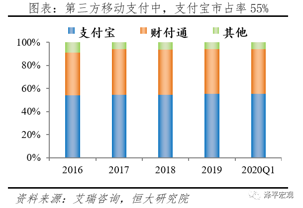 2)依托阿里生态场景,提高客户粘性。支付宝脱胎于阿里巴巴生态体系,截至2020年6月阿里巴巴国内零售市场移动月活用户数达8.74亿,线上线下、国内国际具有丰富的应用场景,包括C2C电商淘宝、B2C电商天猫、B2B电商1688、O2O新零售盒马等,生活服务包括公共事业缴费、饿了么、飞猪等,国际业务包括天猫国际、速卖通等,支付业务具有高频的特点,丰富的场景导流加大了客户的粘性。